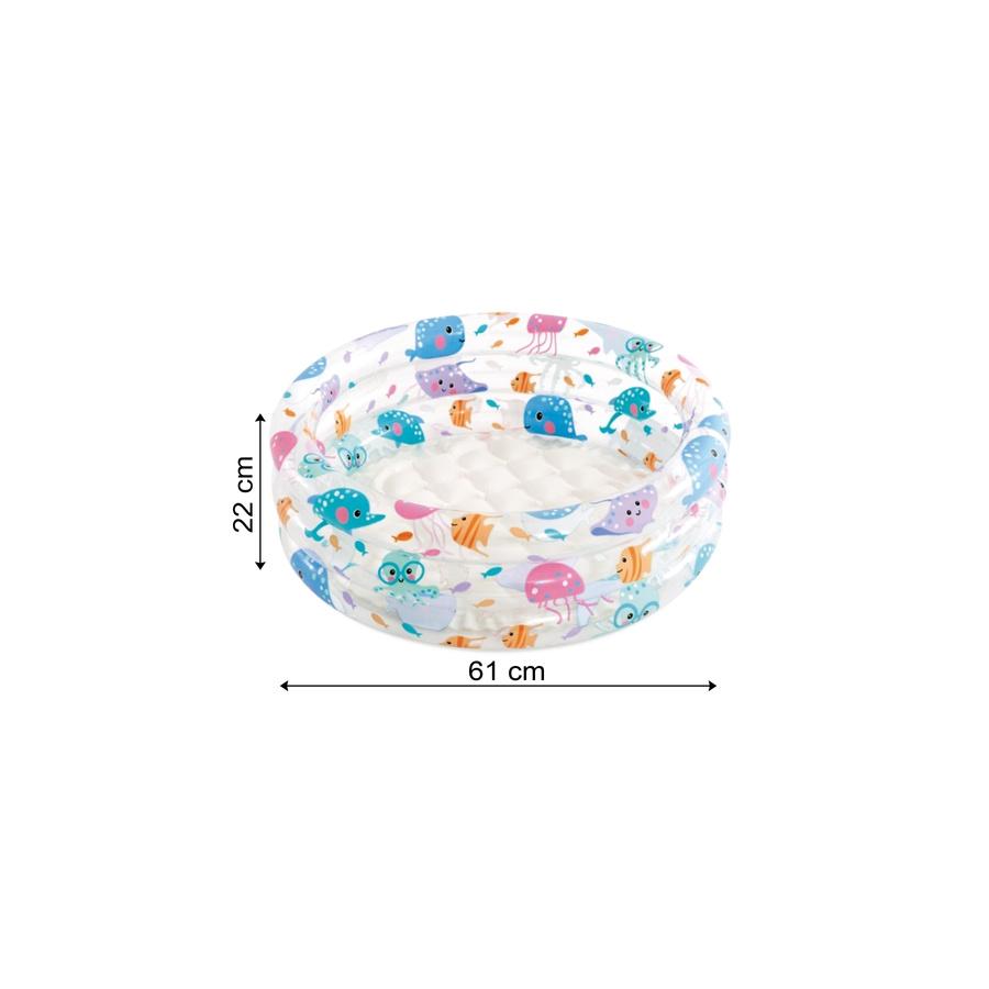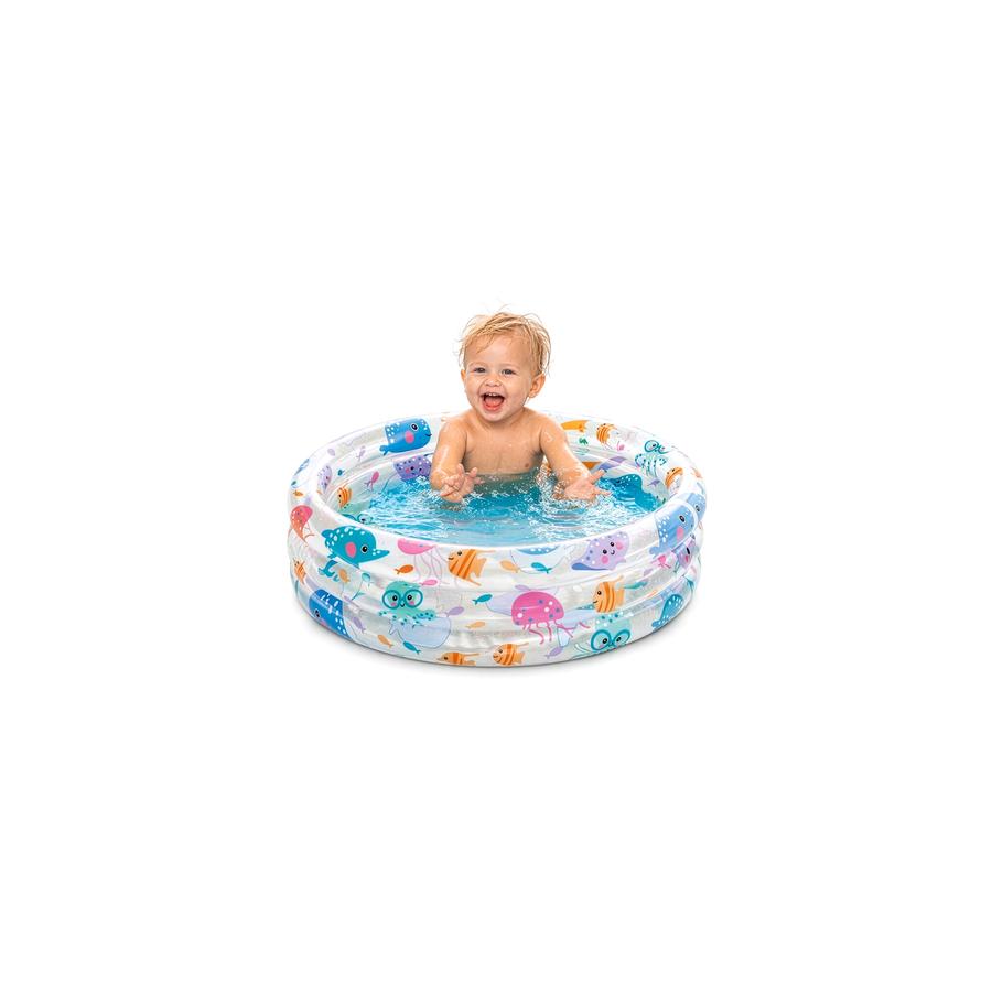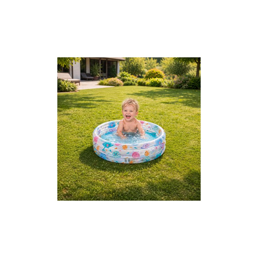 Okrúhly nafukovací bazén pre deti s potlačou morských zvierat, vyrobený z vysoko kvalitného materiálu a navrhnutý podľa najnovších trendov.