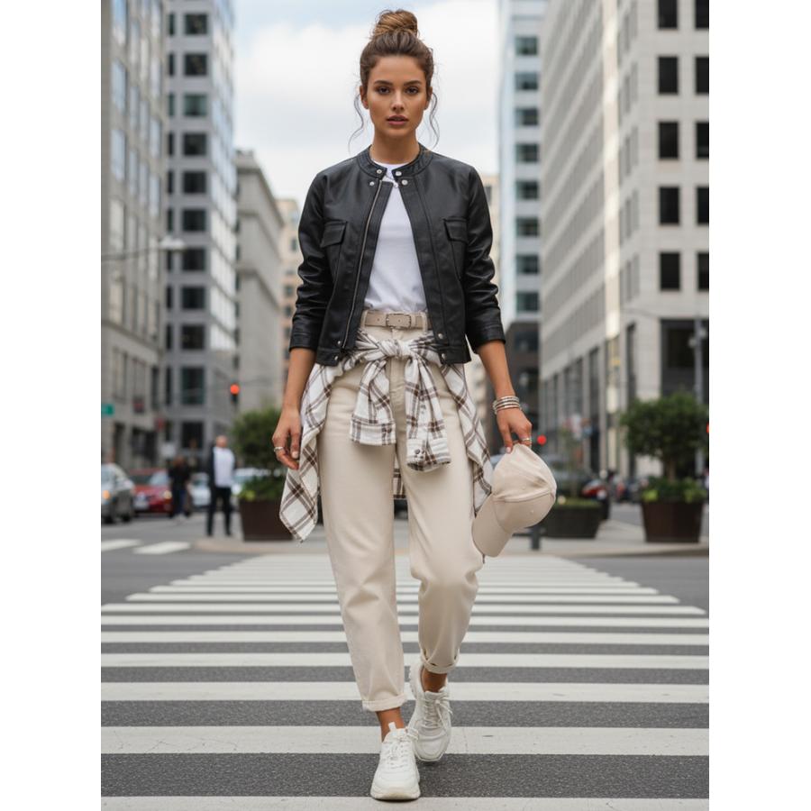 Bunda je vyrobená z umelej kože, ktorá jej dodáva hladkú textúru a štruktúrovaný vzhľad. Je ideálna pre mestský štýl, nosí sa s džínsami, nohavicami alebo šatami. Jej všestranný dizajn umožňuje kombinovať ju so športovou aj klasickejšou obuvou.