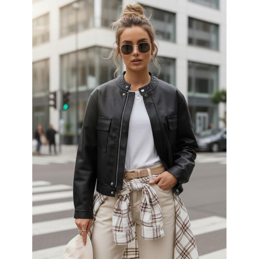Dámska kožená bunda v čiernej farbe, vyrobená z vysoko kvalitného materiálu a navrhnutá podľa najnovších módnych trendov.