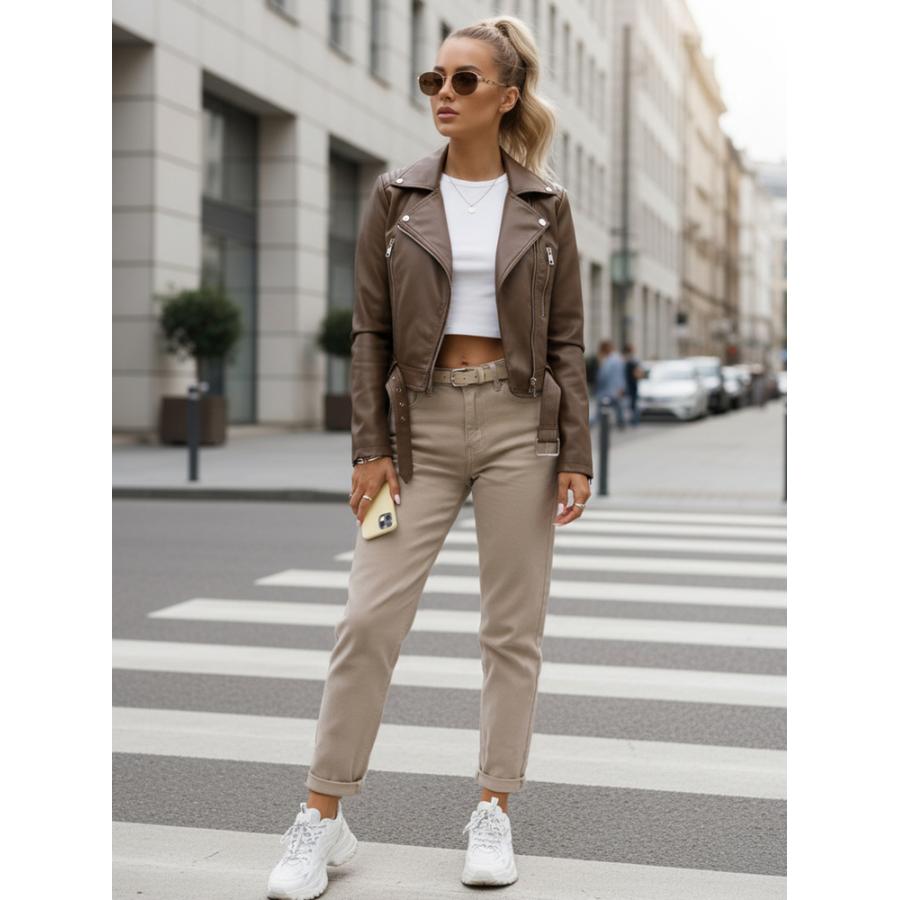 Dámska kožená bunda v svetlohnedej farbe, vyrobená z vysoko kvalitného materiálu a navrhnutá podľa najnovších módnych trendov.