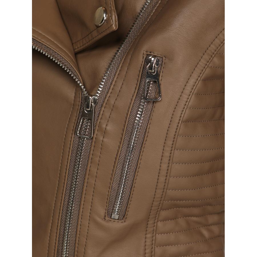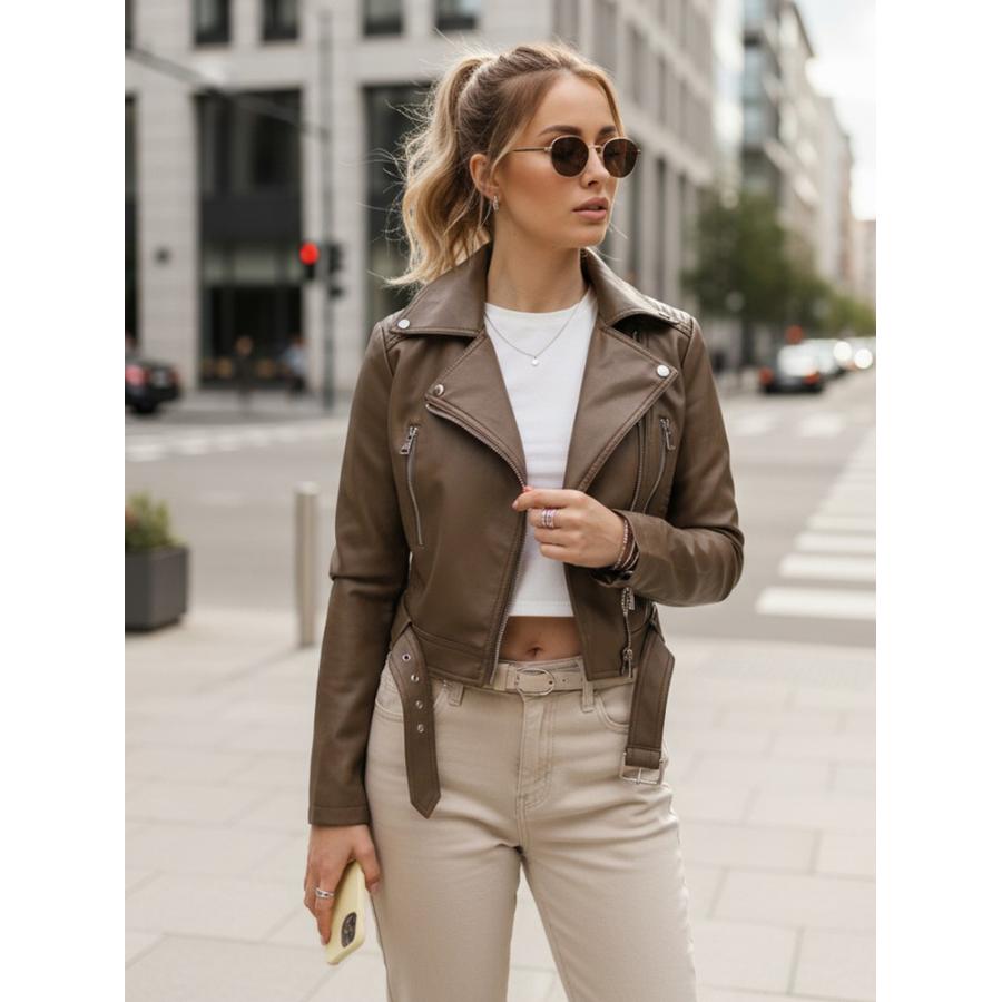 Táto dámska bunda má klasickú siluetu motorkárskej bundy a je určená na každodenné nosenie počas prechodného obdobia. Jej krátka silueta a prepracované detaily dodávajú štýlu osobitý charakter. Dizajn umožňuje slobodu pohybu a celodenné pohodlie. Bunda je vyrobená z umelej kože.