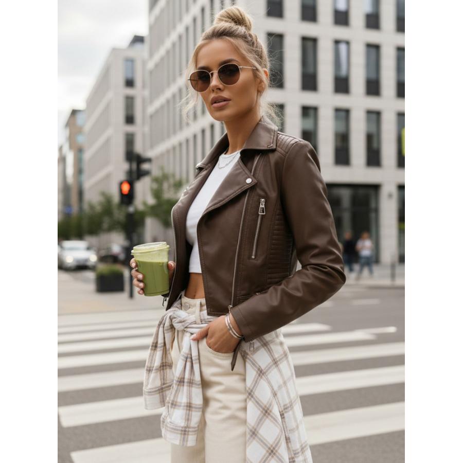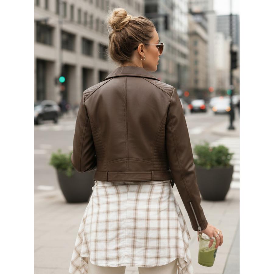 Dámska kožená bunda v hnedej farbe, vyrobená z vysoko kvalitného materiálu a navrhnutá podľa najnovších módnych trendov.