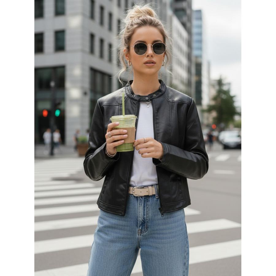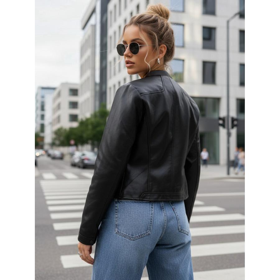 Dámska kožená bunda v čiernej farbe so stojačikom, vyrobená z vysoko kvalitného materiálu a navrhnutá podľa najnovších módnych trendov.