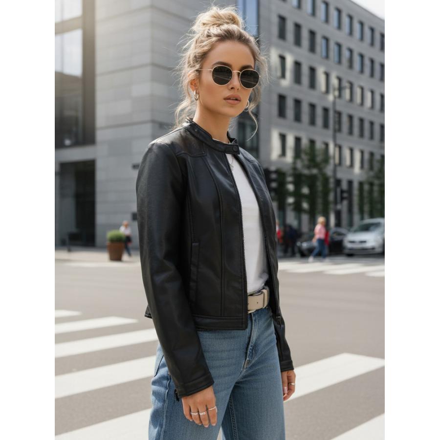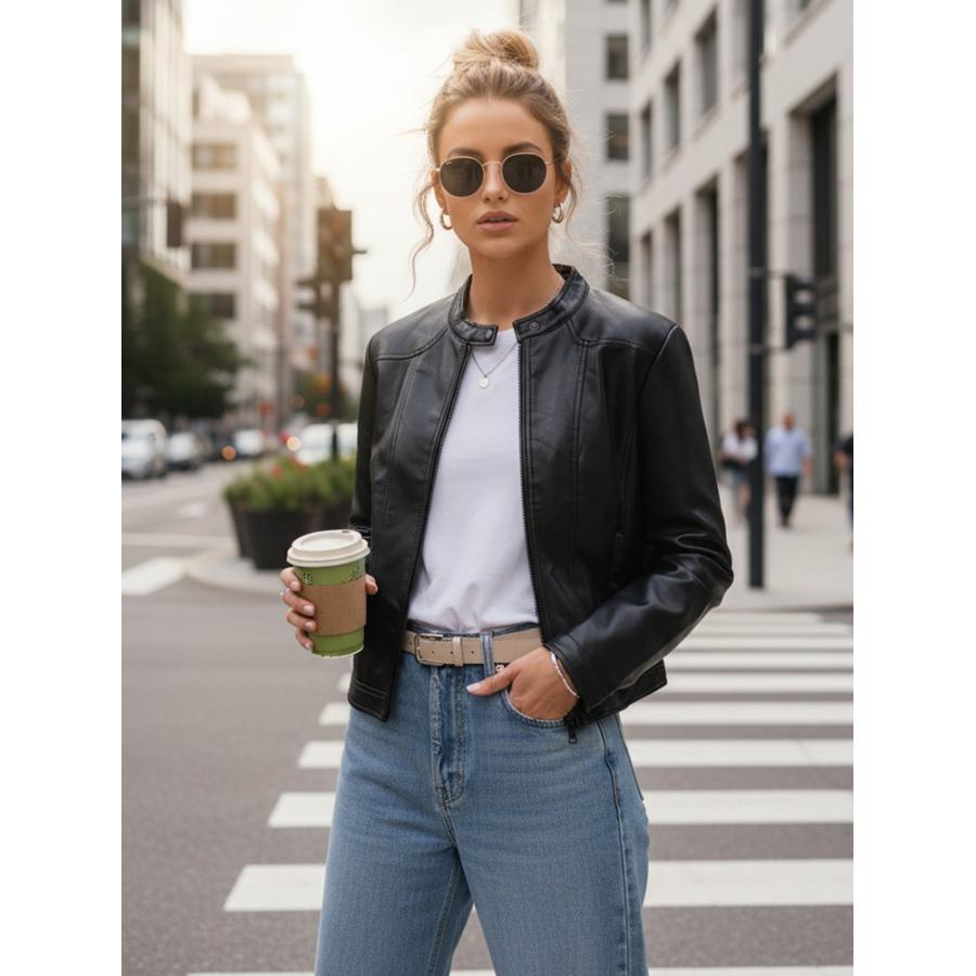 Dámska kožená bunda klasického vypasovaného tvaru určená na každodenné nosenie v prechodnom období. Model vyniká minimalistickým strihom a stojačikom, ktorý zvýrazňuje moderný charakter celku. Dizajn zaisťuje pohodlie pri nosení a voľnosť pohybu. Bunda vyrobená z ekologickej kože.