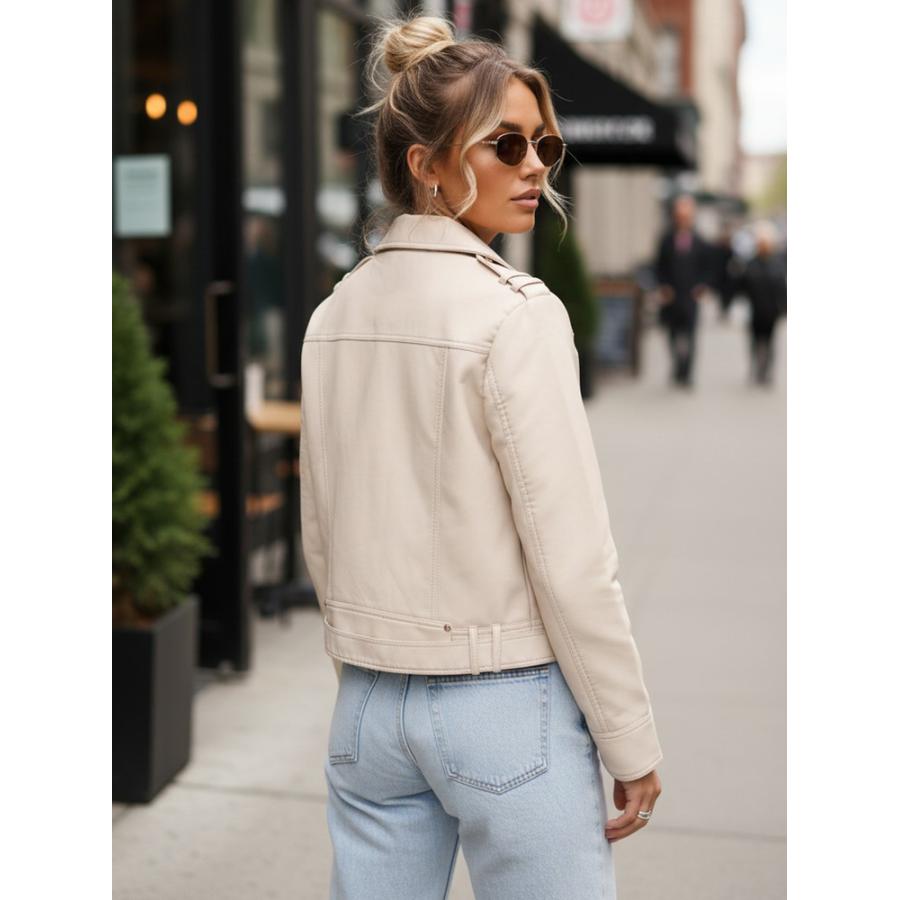 Táto štýlová dámska motorkárska bunda je nadčasovým prvkom šatníka inšpirovaným klasickým motorkárskym štýlom. Jej priliehavý strih lichotí postave, zatiaľ čo výrazné detaily dodávajú módny mestský nádych. Táto bunda je vyrobená z umelej kože a je ideálna na každodenné aj sofistikovanejšie outfity.