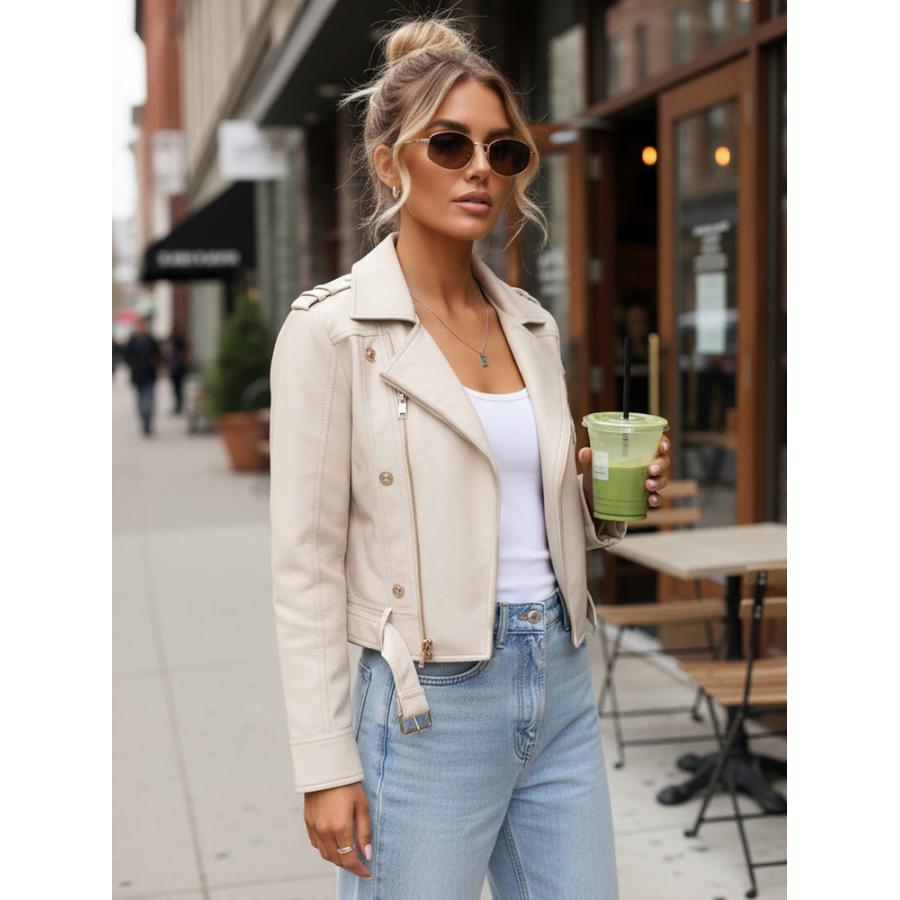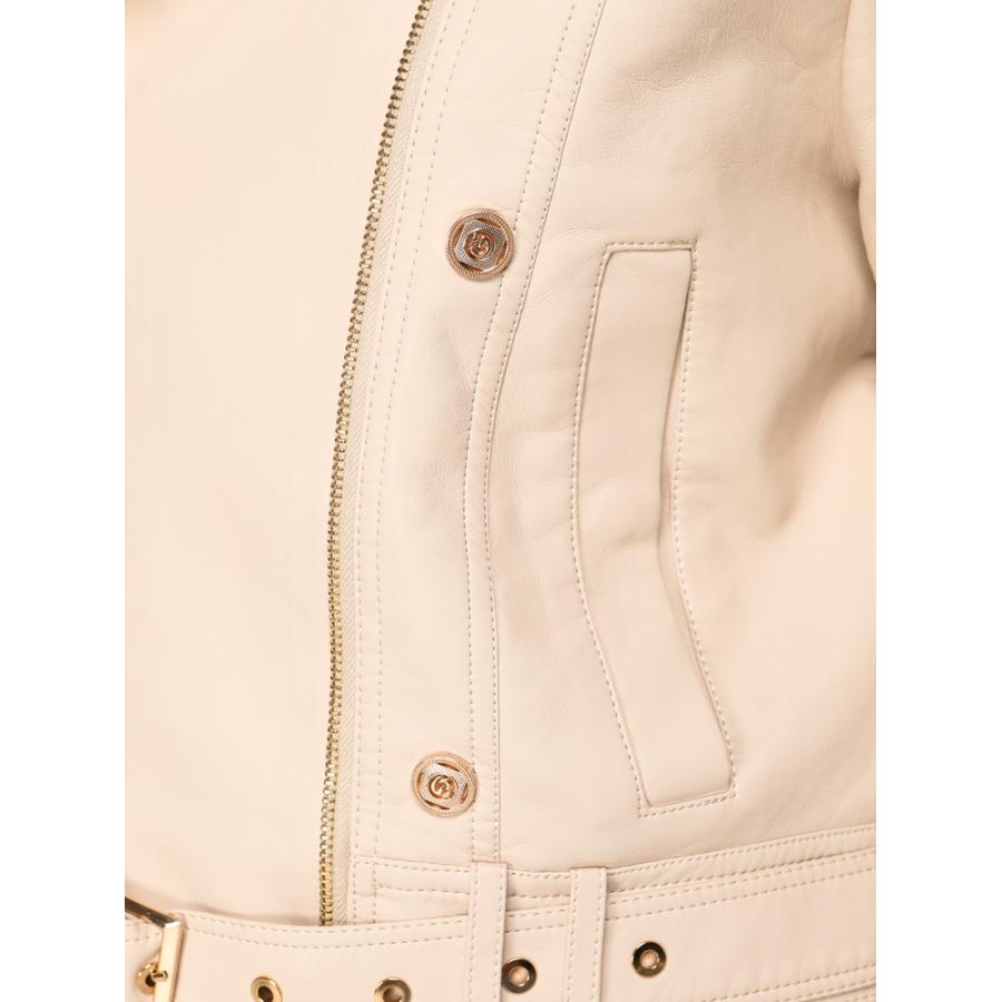 Dámska kožená bunda v béžovej farbe s opaskom, vyrobená z vysoko kvalitného materiálu a navrhnutá podľa najnovších módnych trendov.