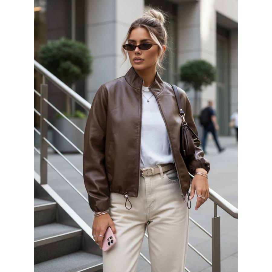 Dámska kožená bomber bunda v hnedej farbe, vyrobená z vysoko kvalitného materiálu a navrhnutá podľa najnovších módnych trendov.