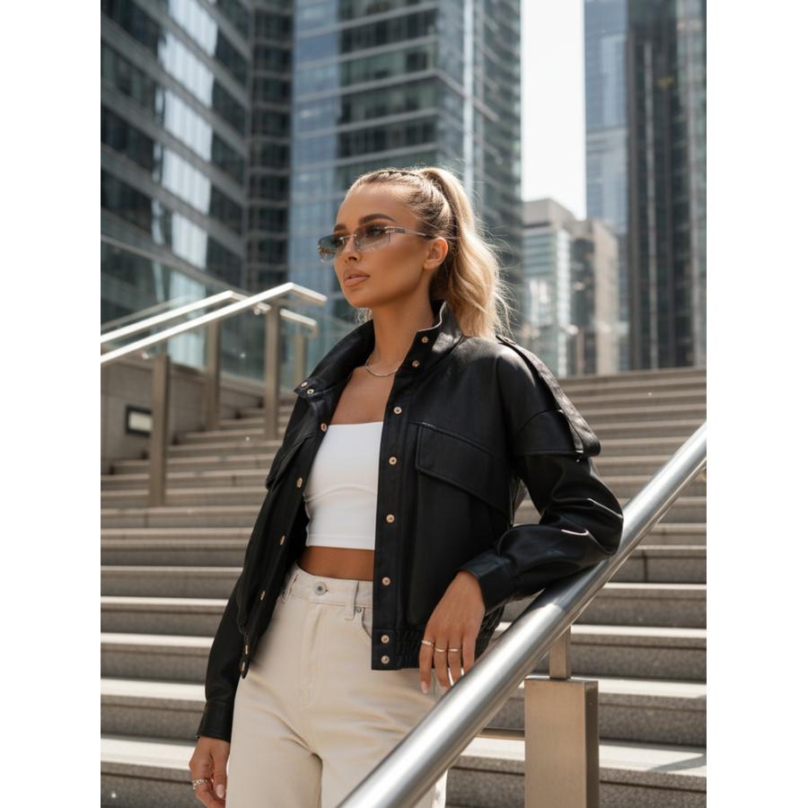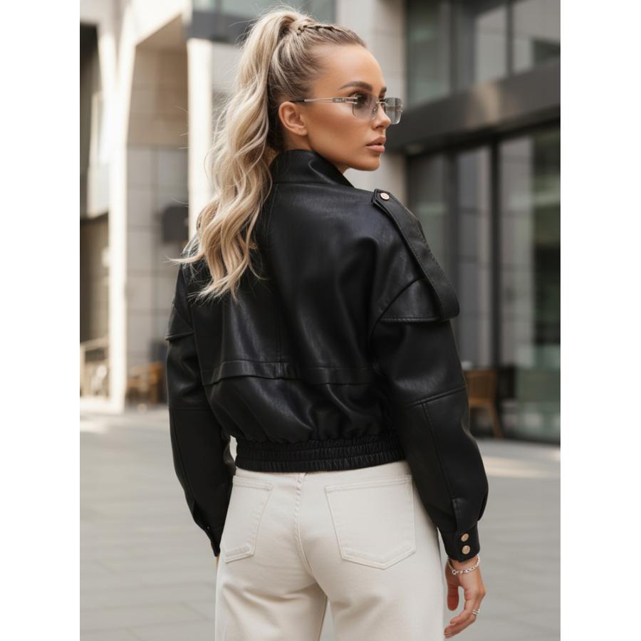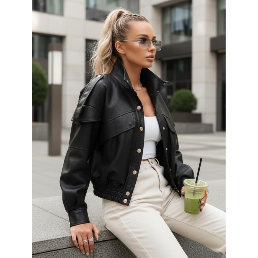 Dámska kožená bunda v čiernej farbe so stojačikom, vyrobená z vysoko kvalitného materiálu a navrhnutá podľa najnovších módnych trendov.