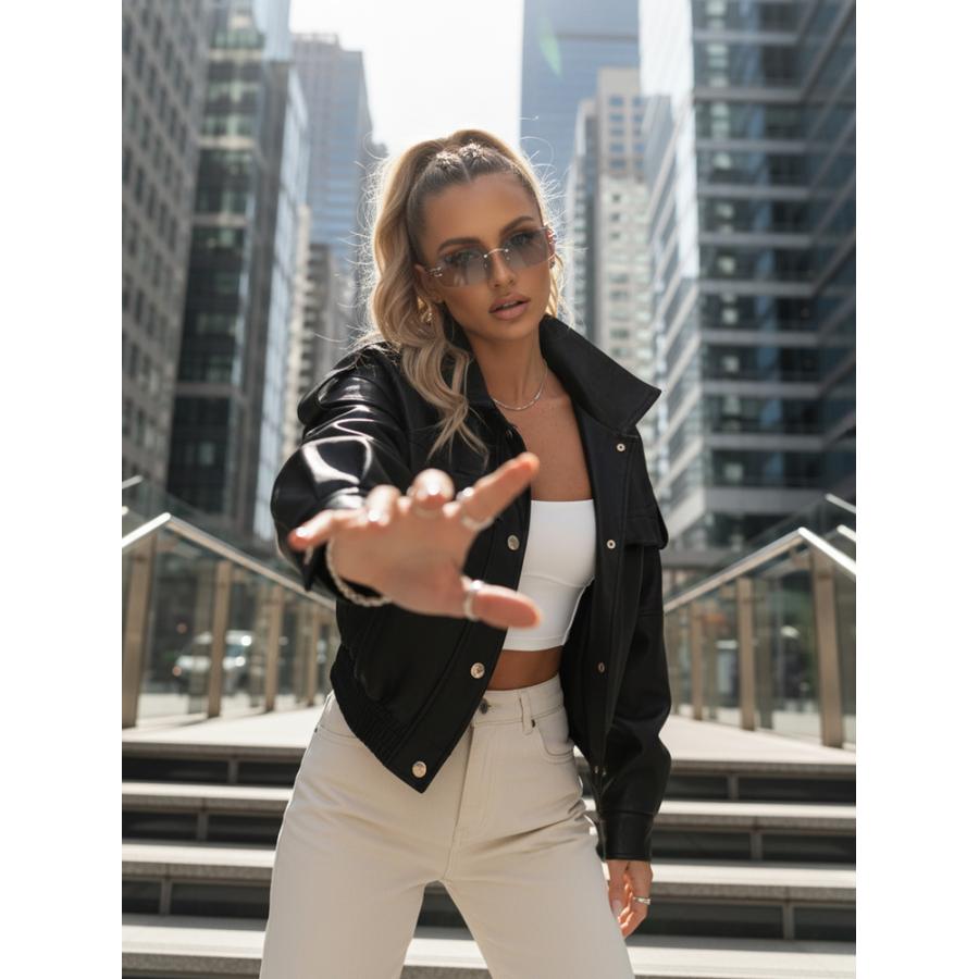 Táto kratšia dámska bunda kombinuje moderné línie s každodenným pohodlím. Minimalistický dizajn zdôrazňuje mestský charakter vzhľadu, zatiaľ čo vysoký golier dodáva výrazný nádych. Bunda dobre sedí a hodí sa k rôznym každodenným outfitom. Bunda je vyrobená z umelej kože.