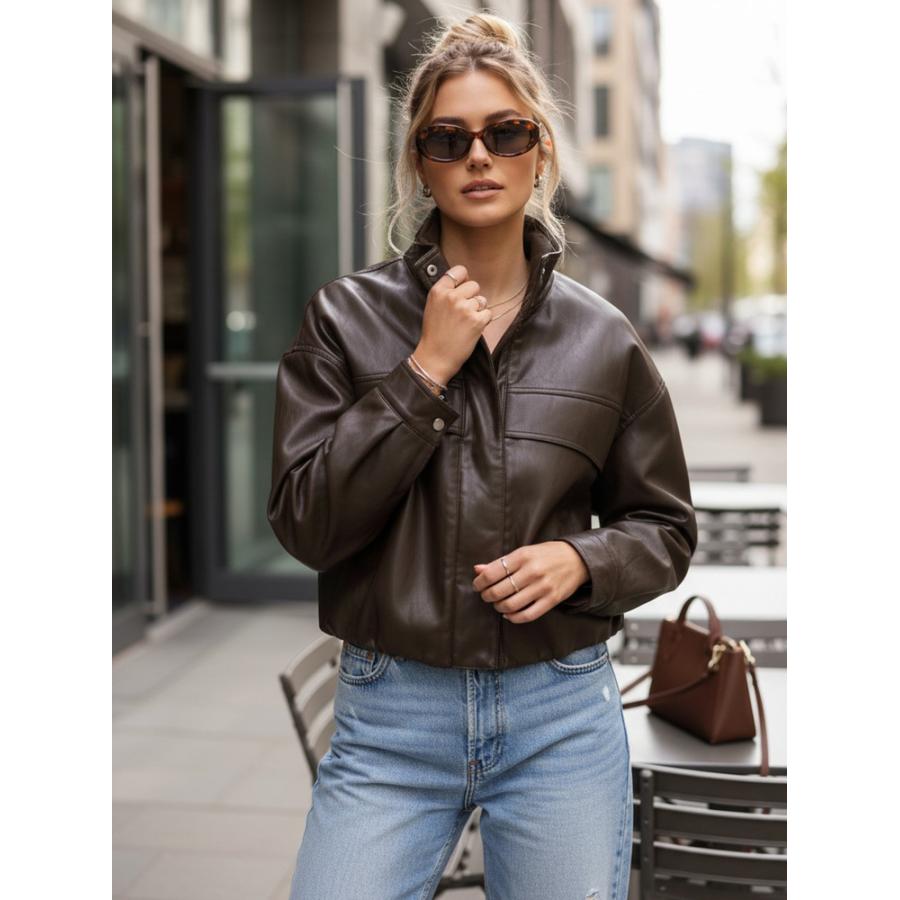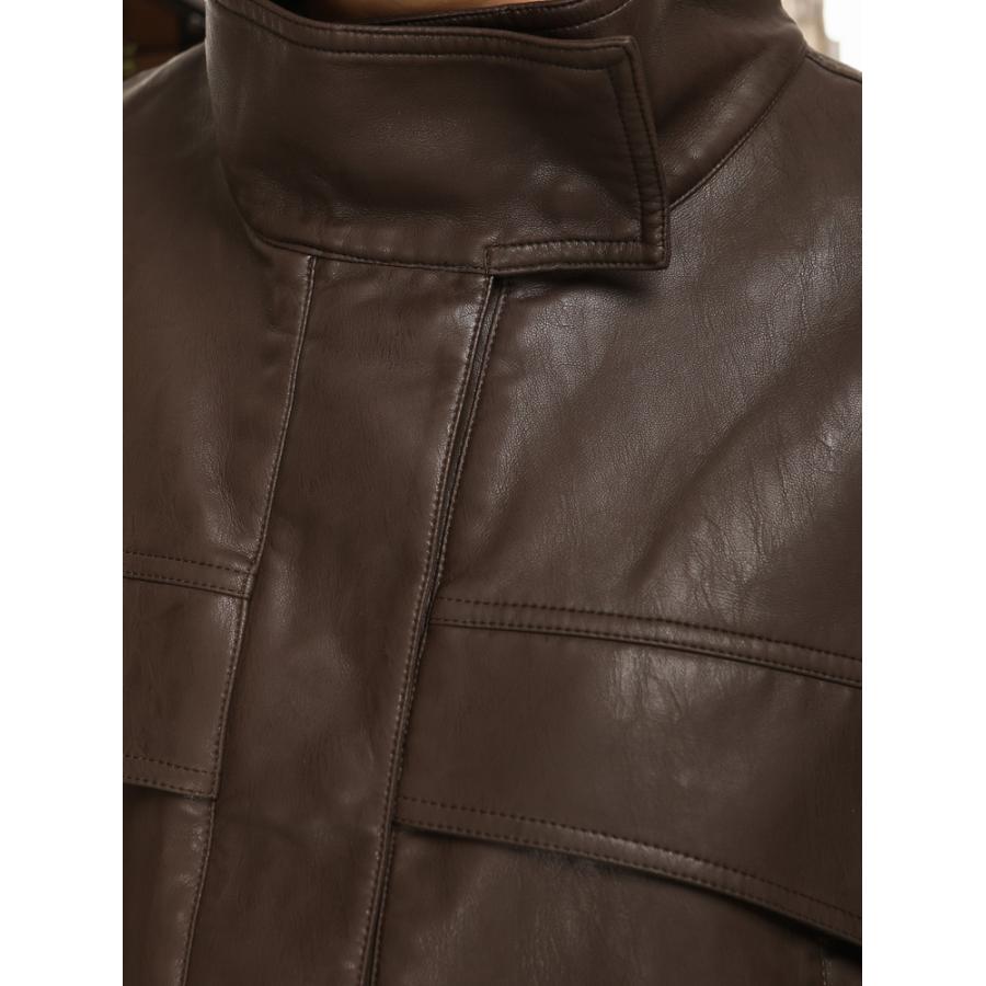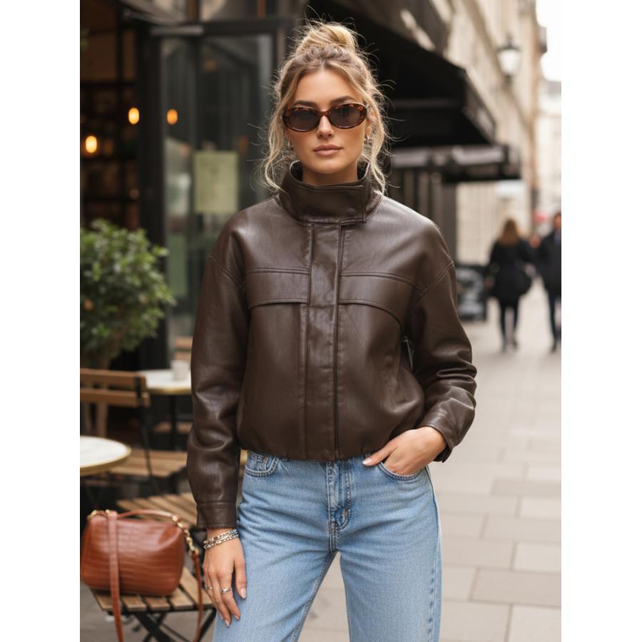 Dámska kožená bunda v hnedej farbe s vysokým golierom, vyrobená z vysoko kvalitného materiálu a navrhnutá podľa najnovších módnych trendov.