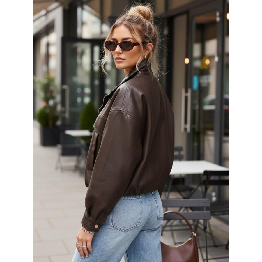 Táto kratšia dámska bunda kombinuje moderné línie s každodenným pohodlím. Voľnejší strih dobre sedí na postave a umožňuje jednoduchý mestský štýl. Vysoký golier dodáva bunde výrazný charakter, zatiaľ čo hladký povrch zdôrazňuje minimalistický vzhľad. Model je vyrobený z umelej kože.