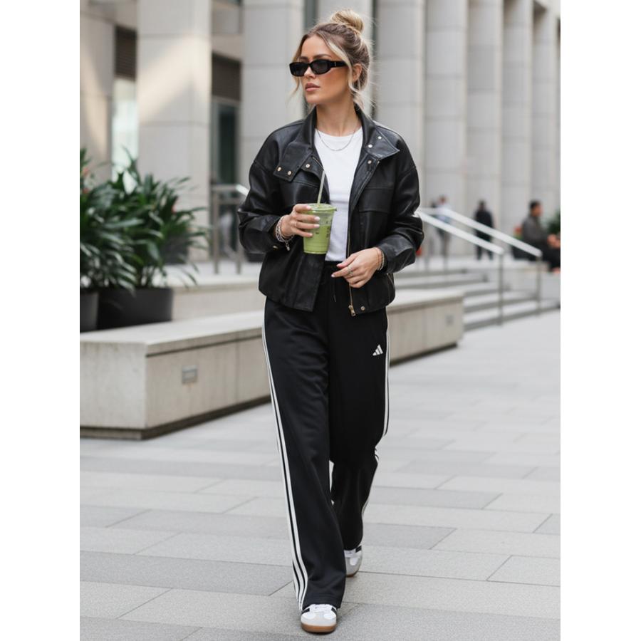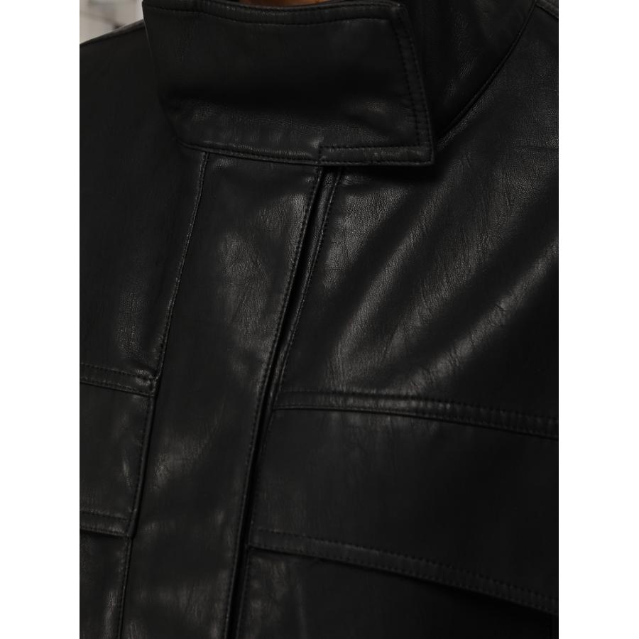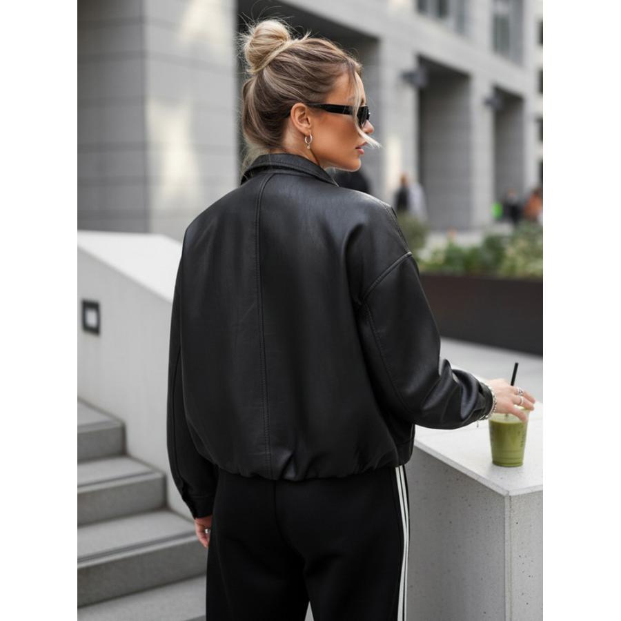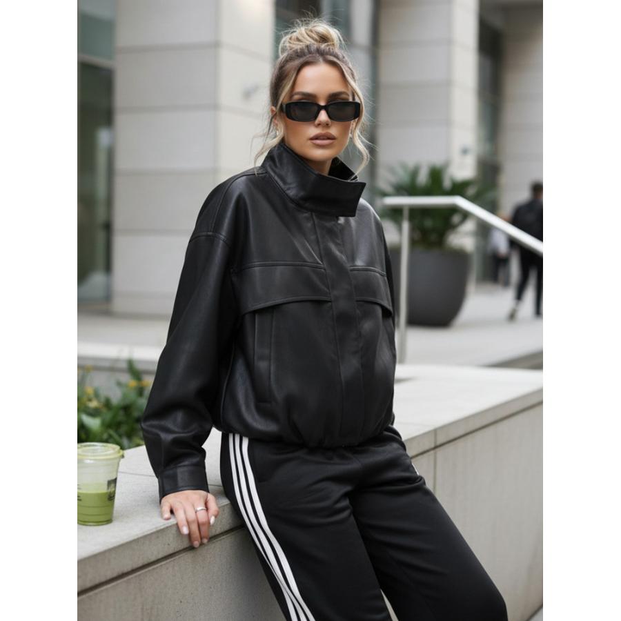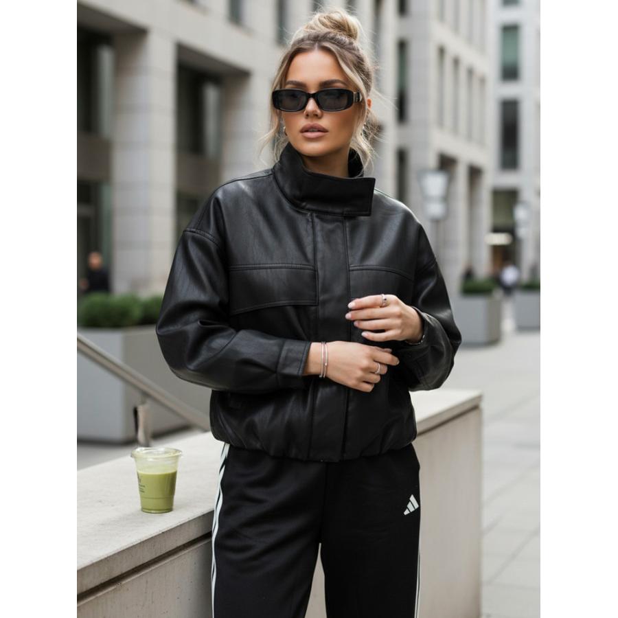 Táto kratšia dámska bunda kombinuje moderné línie s každodenným pohodlím. Voľnejší strih dobre sedí na postave a umožňuje jednoduchý mestský štýl. Vysoký golier dodáva bunde výrazný charakter, zatiaľ čo hladký povrch zdôrazňuje minimalistický vzhľad. Model je vyrobený z umelej kože.