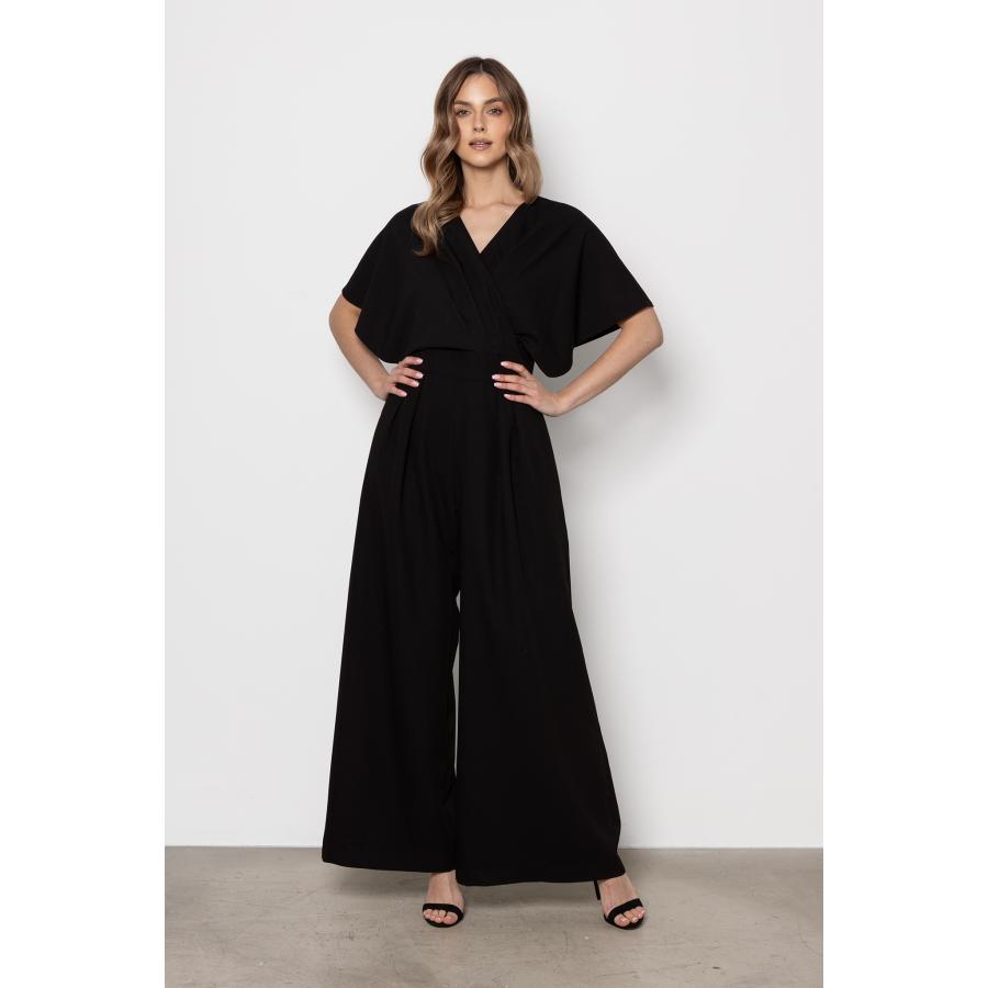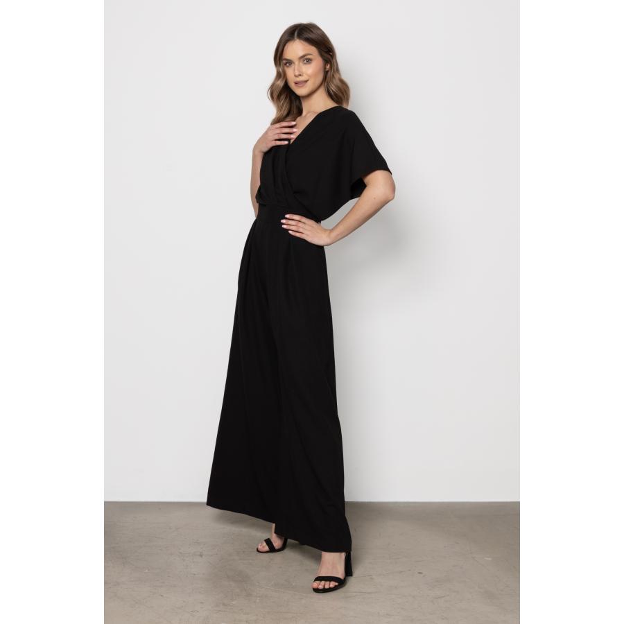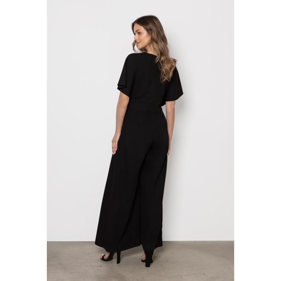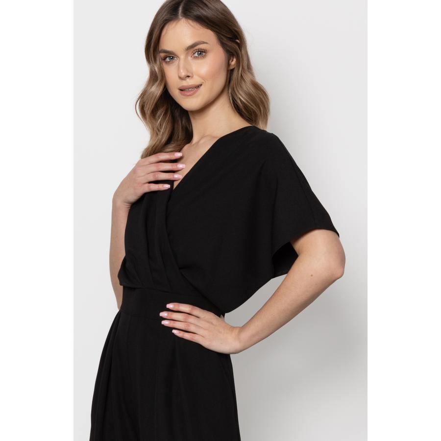 Dámsky elegantný overal v čiernej farbe so širokými nohavicami a obálkovým výstrihom, vyrobený z vysoko kvalitného materiálu a navrhnutý podľa najnovších módnych trendov.