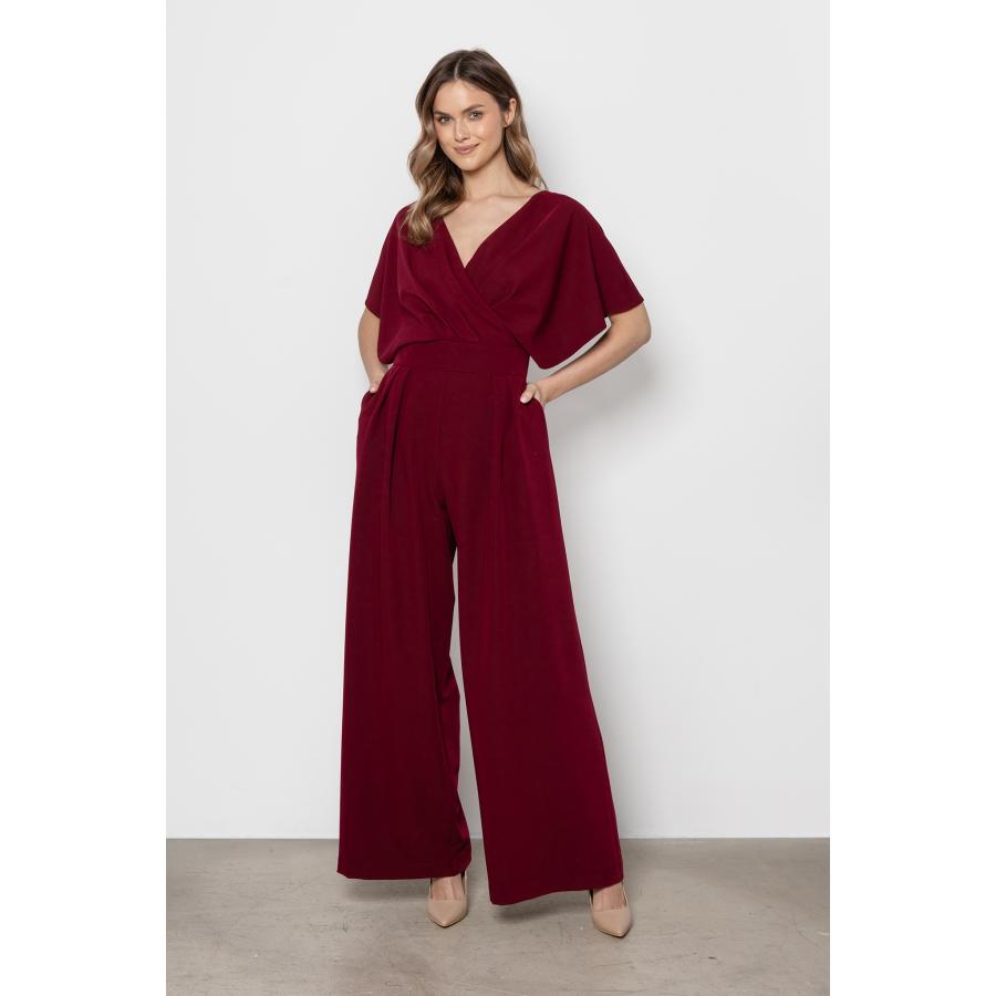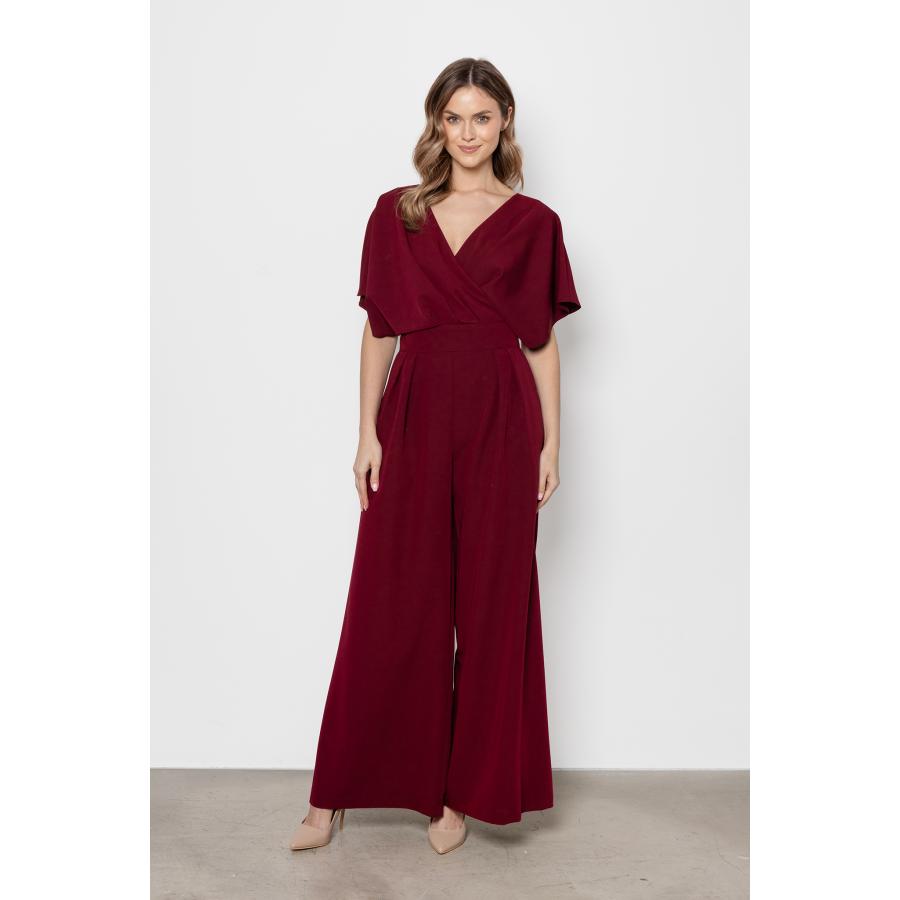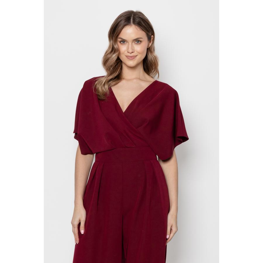 Dámsky elegantný overal v bordovej farbe so širokými nohavicami a obálkovým výstrihom, vyrobený z vysoko kvalitného materiálu a navrhnutý podľa najnovších módnych trendov.