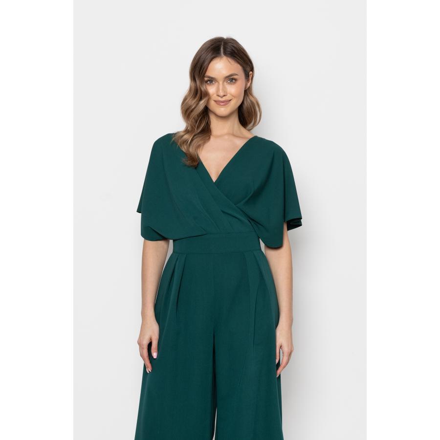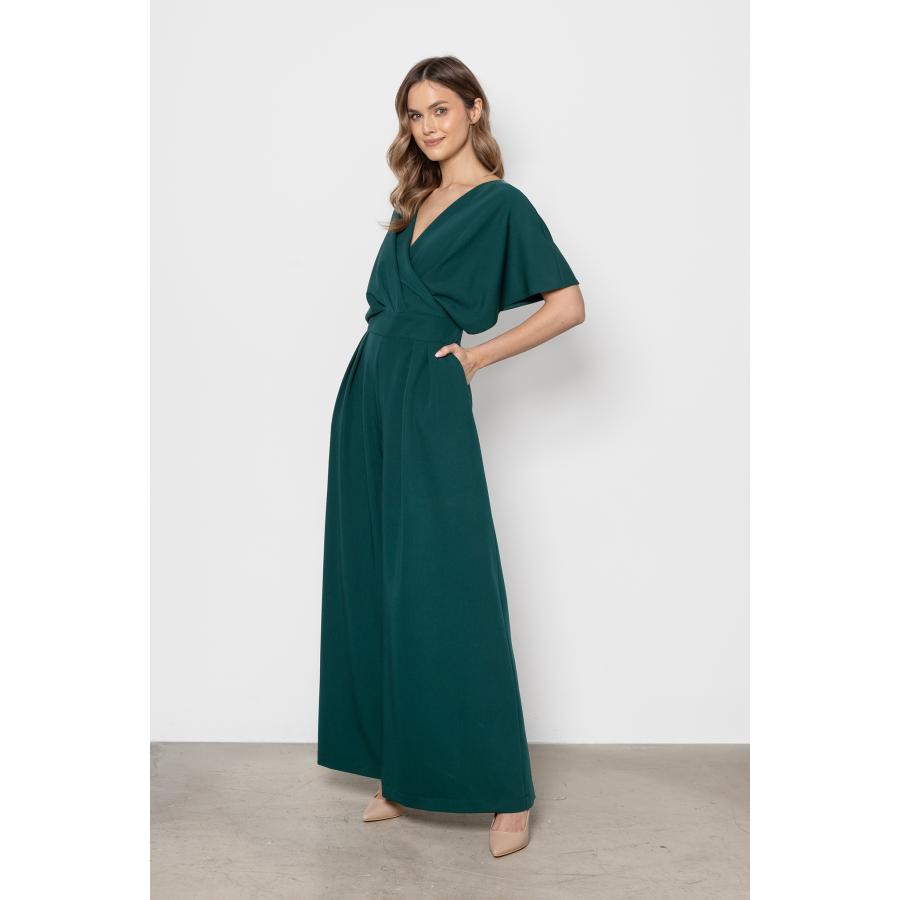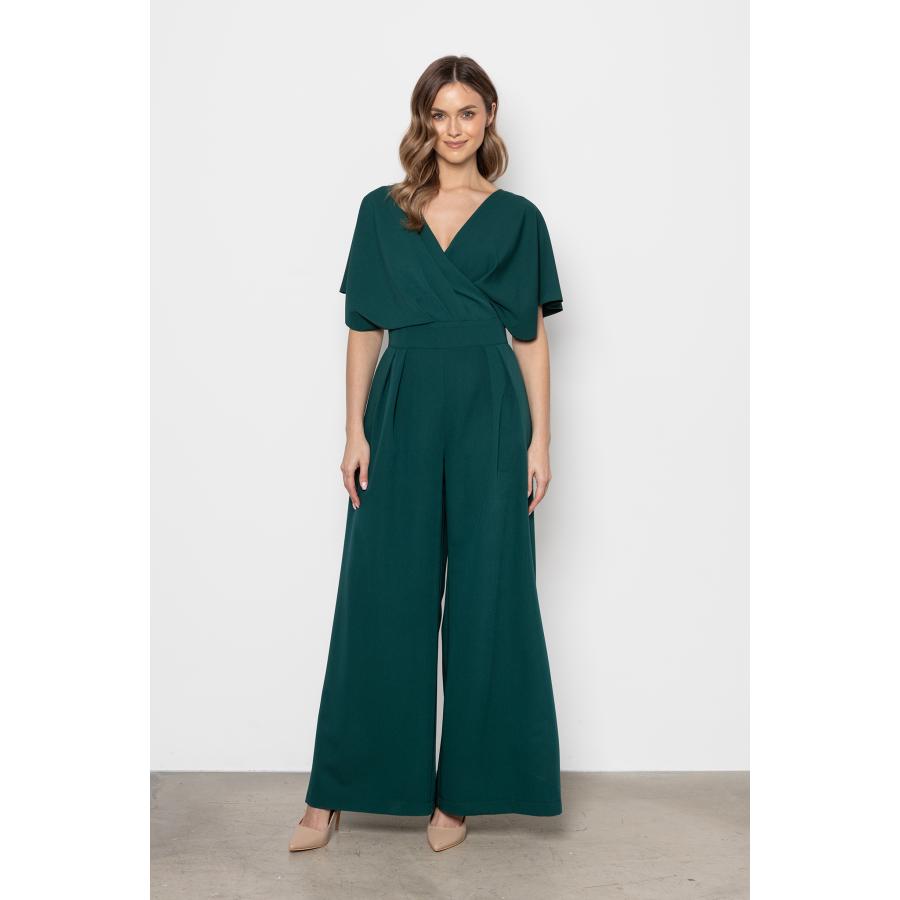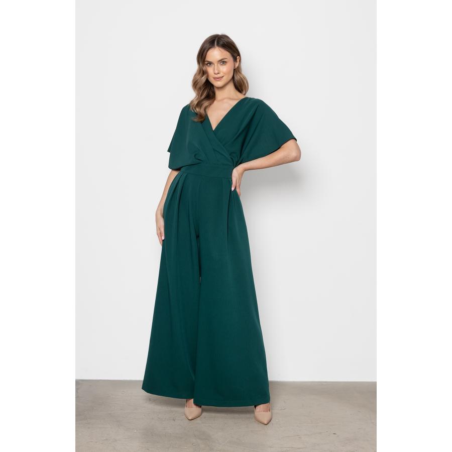 Dámsky elegantný overal v zelenej farbe so širokými nohavicami a obálkovým výstrihom, vyrobený z vysoko kvalitného materiálu a navrhnutý podľa najnovších módnych trendov.