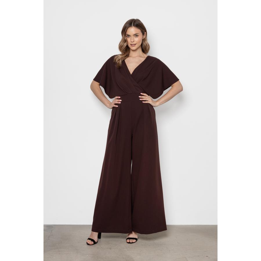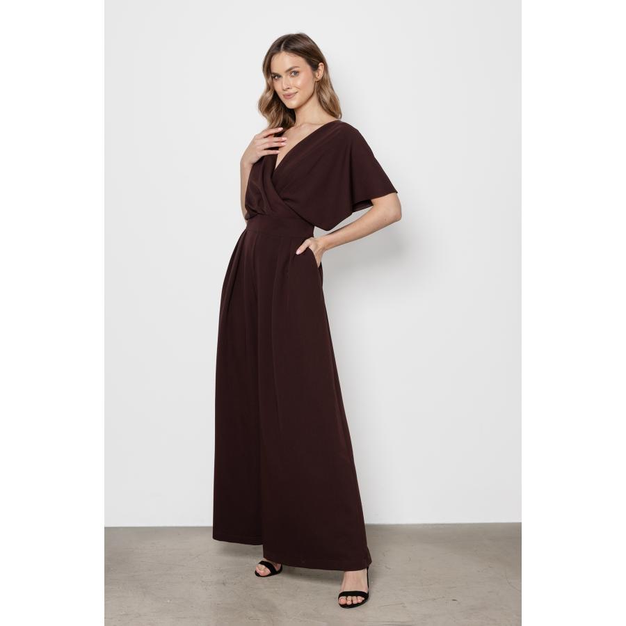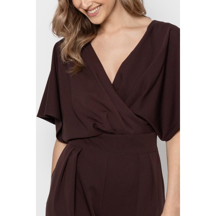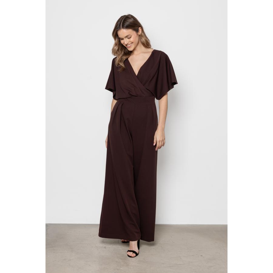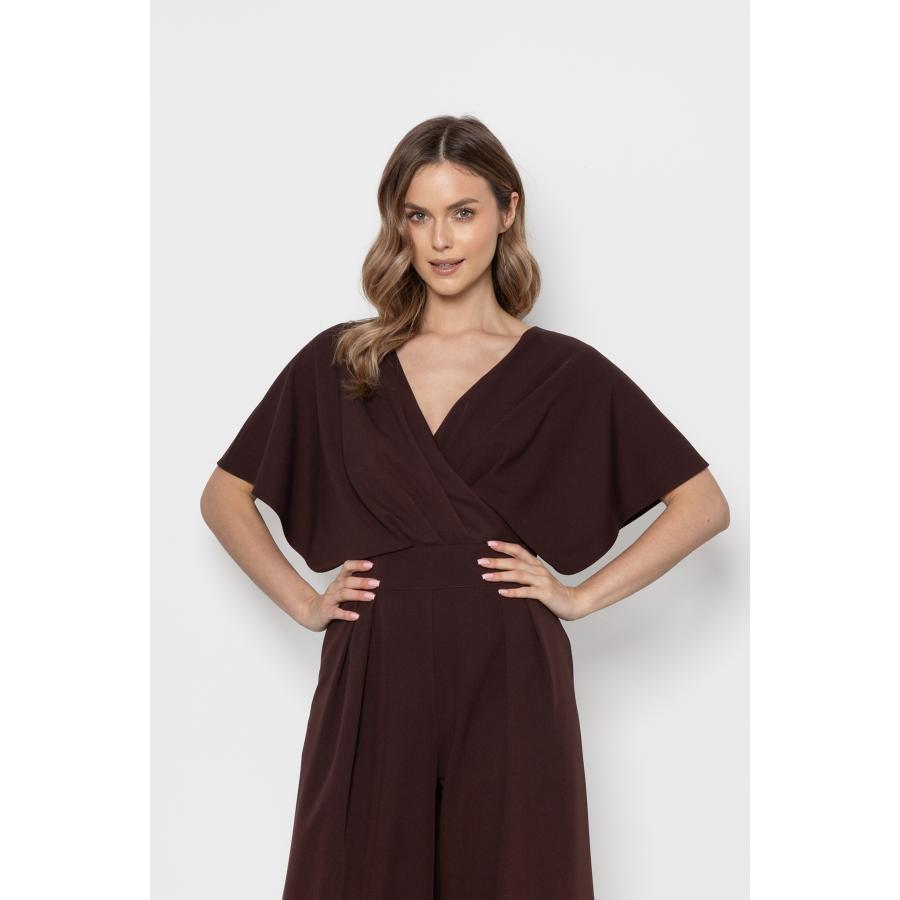 Dámsky elegantný overal v čokoládovej farbe so širokými nohavicami a obálkovým výstrihom, vyrobený z vysoko kvalitného materiálu a navrhnutý podľa najnovších módnych trendov.