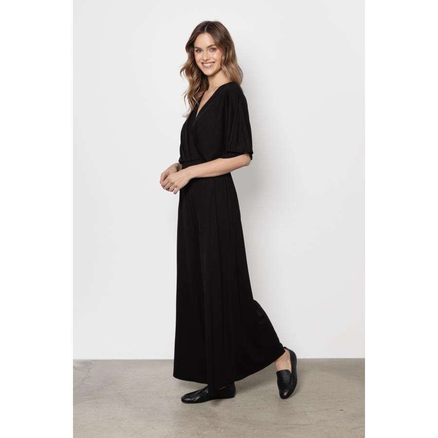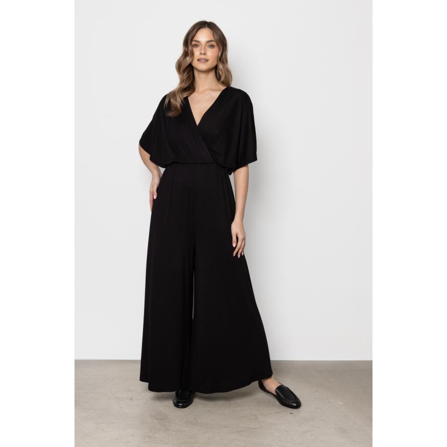 Dámsky pohodlný overal v čiernej farbe so širokými nohavicami a obálkovým výstrihom, vyrobený z vysoko kvalitného materiálu a navrhnutý podľa najnovších módnych trendov.