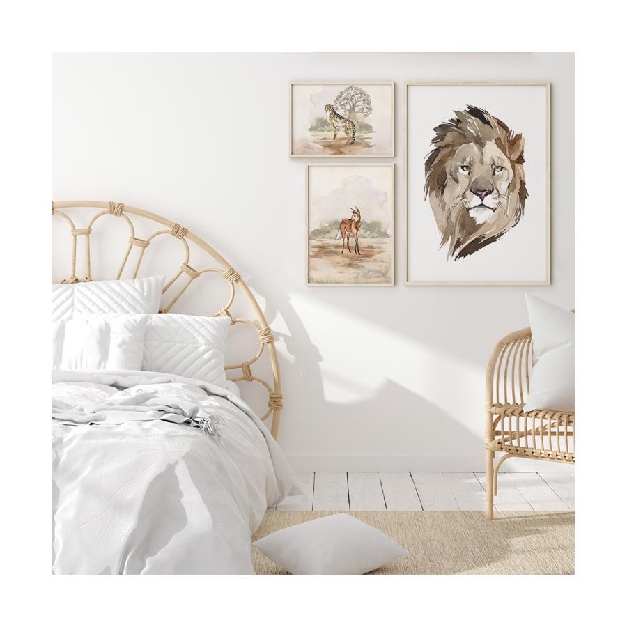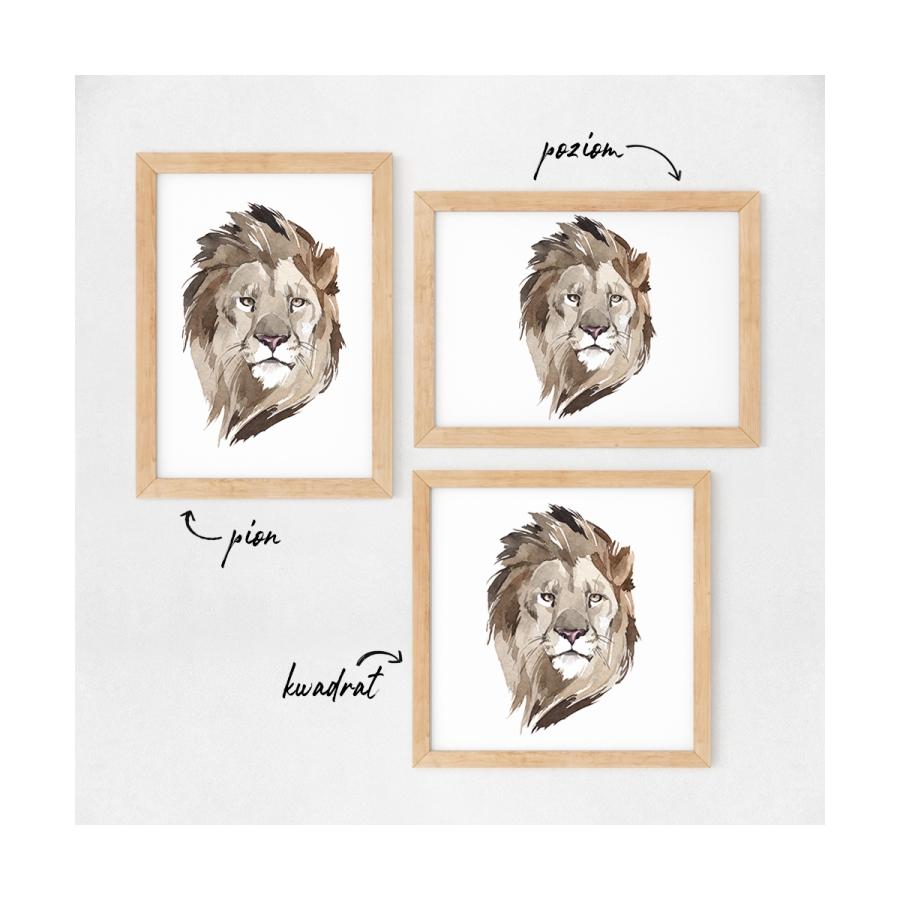 Nástenný plagát z kolekcie safari s portrétom leva, vyrobený z vysoko kvalitného materiálu, ktorý oživí a obohatí váš interiér.