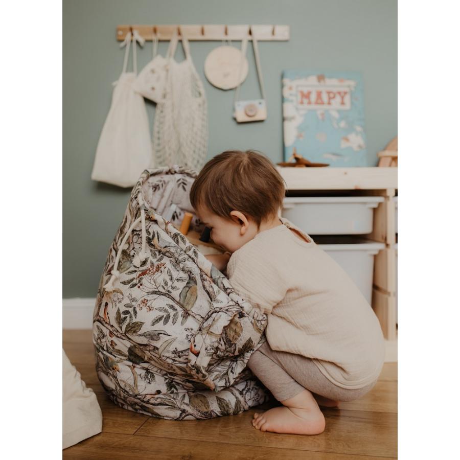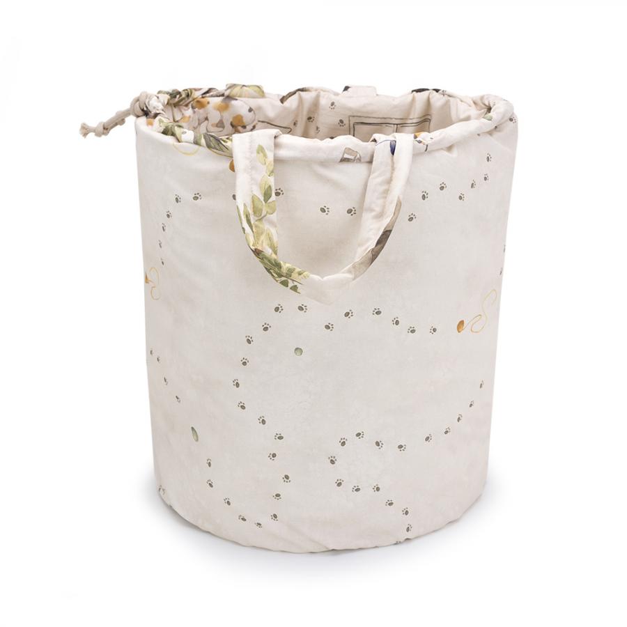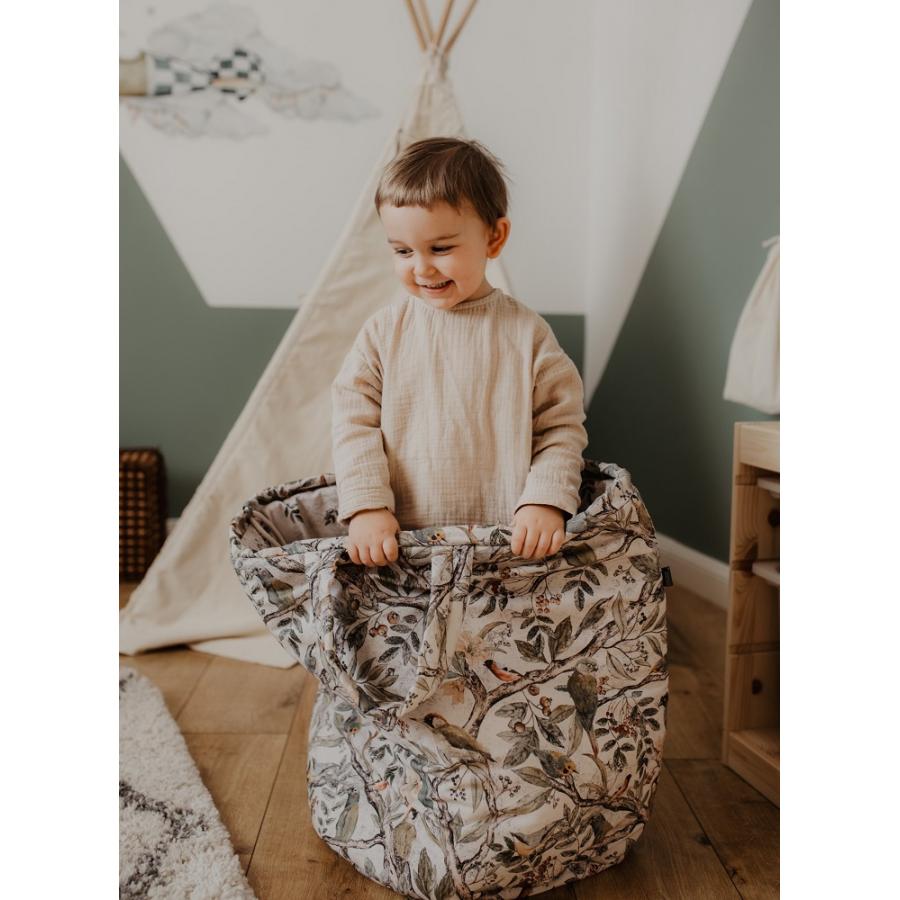 Prináša poriadok a štýl do detskej izby. Nestráca svoj tvar ani keď je prázdny. Kôš je veľmi priestranný, pojme veľa hračiek alebo iných pokladov. Je tiež ideálny na ukladanie prikrývok, vankúšov alebo oblečenia. Má pevné a veľmi odolné uši, ktoré uľahčujú prenášanie, zatiaľ čo šnúrky vám umožňujú zviazať ho ako vrece.
