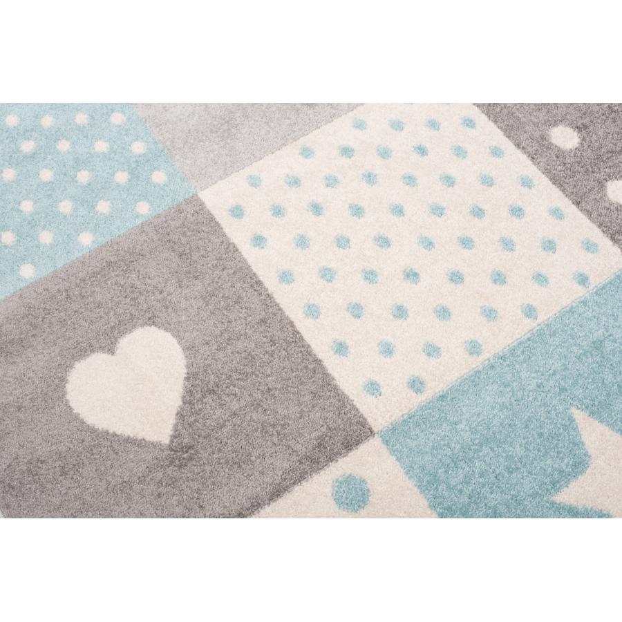 Bielo-tyrkysový koberec so vzormi, vyrobený z vysoko kvalitného materiálu a navrhnutý podľa najnovších módnych trendov.