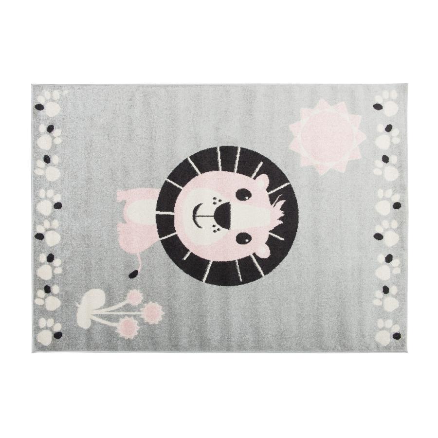 Svetlo-sivý detský koberec s levom, vyrobený z vysoko kvalitného materiálu a navrhnutý podľa najnovších módnych trendov.