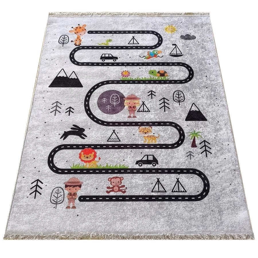 Moderný koberec so vzorom pre deti v sivej farbe, vyrobený z vysoko kvalitného materiálu a navrhnutý podľa najnovších módnych trendov.