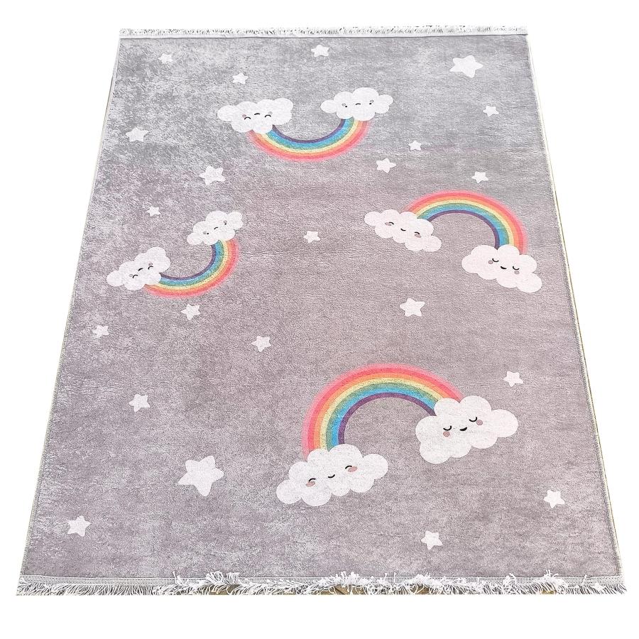 Detský koberec s motívom dúhy v sivej farbe, vyrobený z vysoko kvalitného materiálu a navrhnutý podľa najnovších módnych trendov.