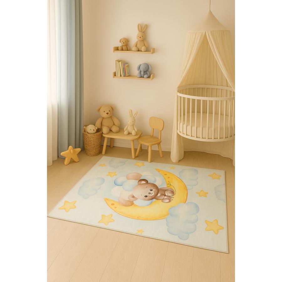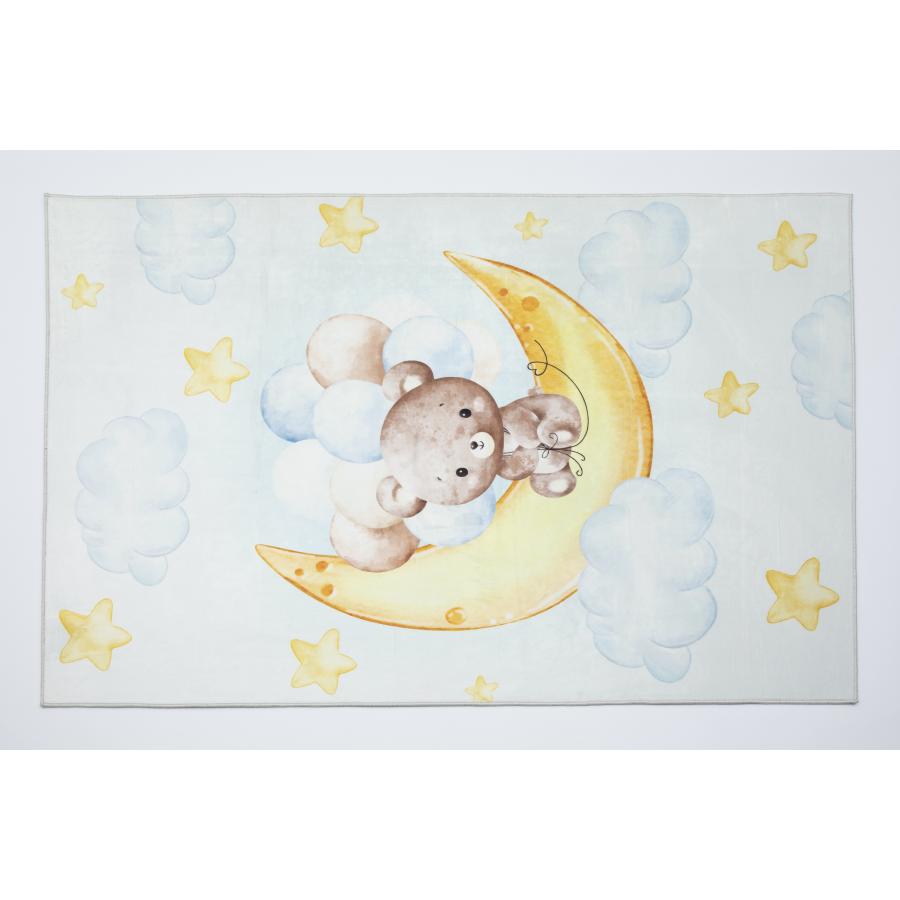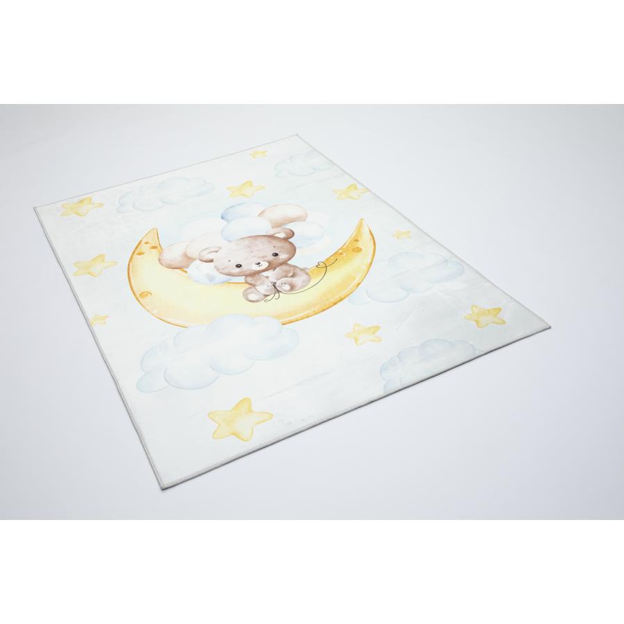 Detský farebný koberec s medveďom na mesiaci, vyrobený z vysoko kvalitného materiálu a navrhnutý podľa najnovších módnych trendov.