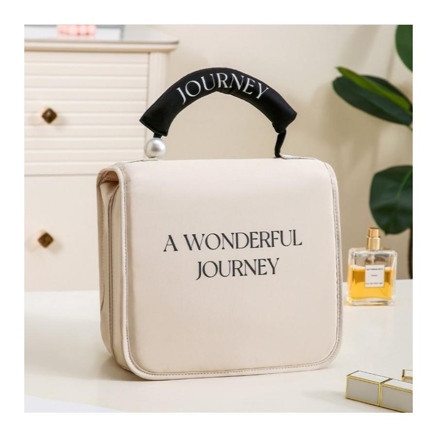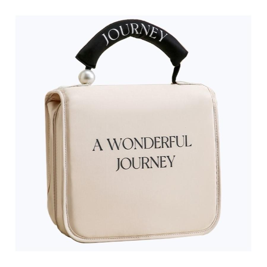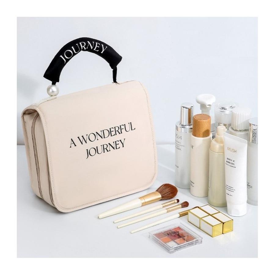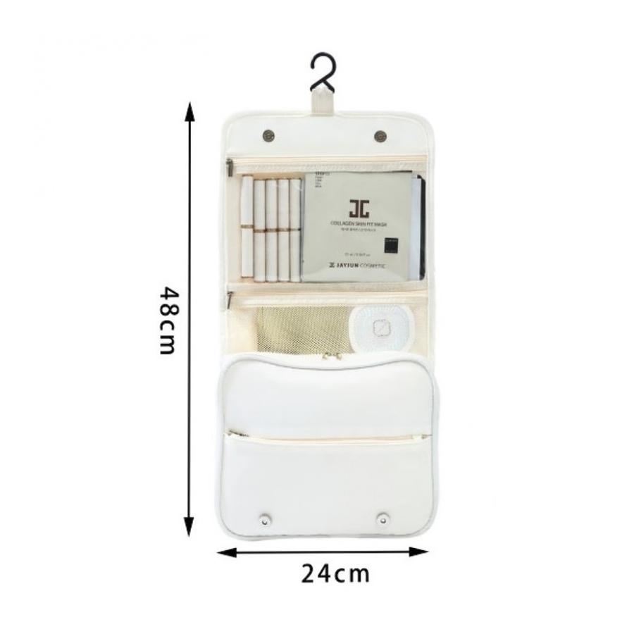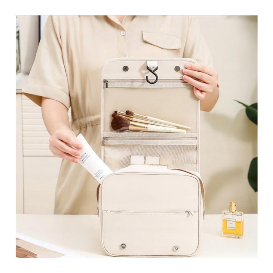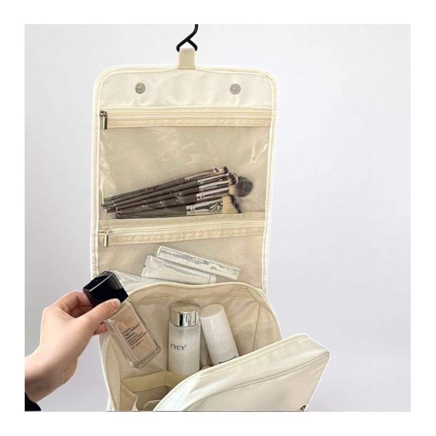 Skladacia kozmetická taška v krémovej farbe, vďaka ktorej budete mať prehľad vo svojej kabelke, taške alebo kufri, vyrobená z kvalitného materiálu.