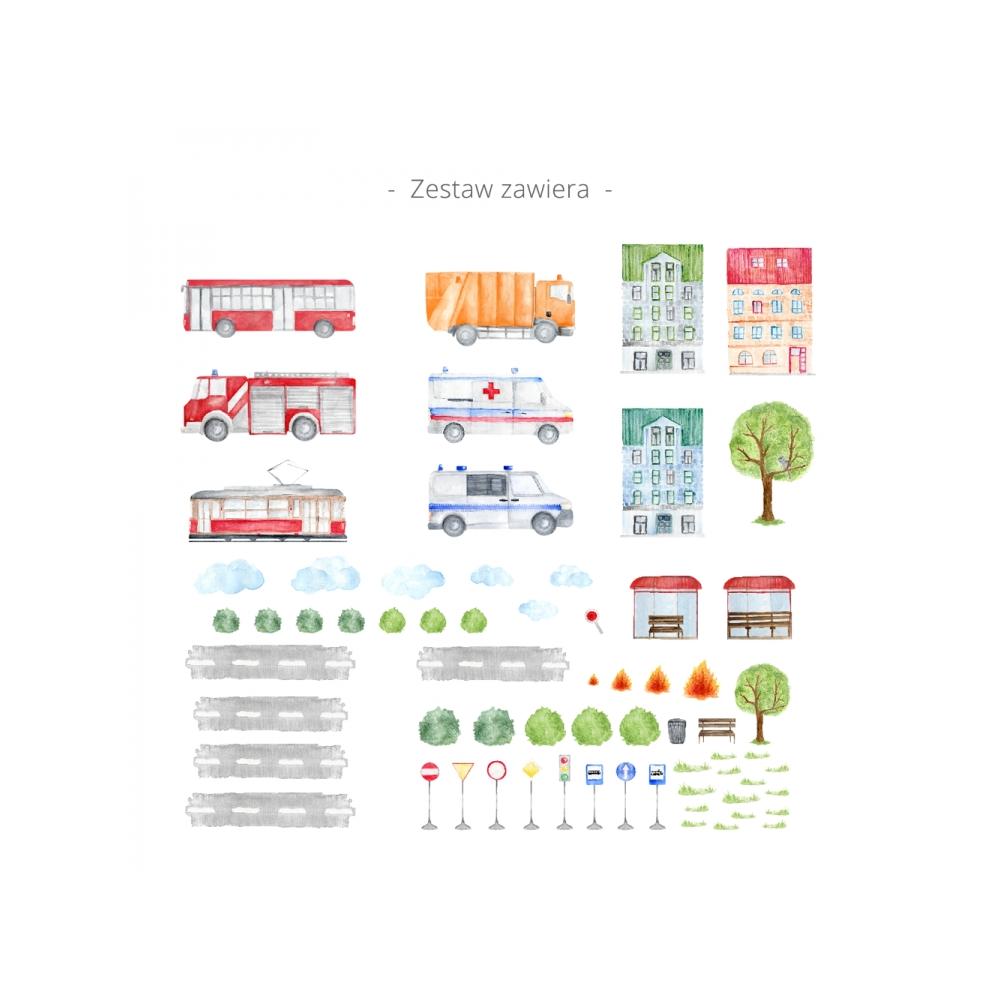 Sada tlačených nálepiek obsahuje všetko potrebné na vytvorenie aranžovania s mestskou tématikou: farebné vozidlá, mestské činžovné domy, dopravné značky, prvky mestskej zelene, cesty.