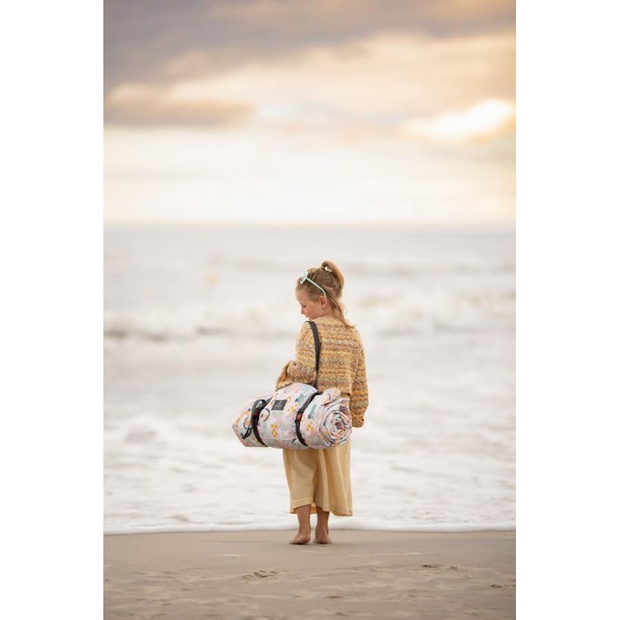 Jedna strana deky je vyrobená z najkvalitnejšej bavlny. V strede je naplnená ľahkou, silikónovou netkanou textíliou, ktorá zabezpečuje mäkkosť a izoláciu od tvrdého povrchu. Spodná časť je silná, impregnovaná tkanina, vďaka ktorej vám ani ranná rosa alebo mokrý piesok nezabránia v zábave.