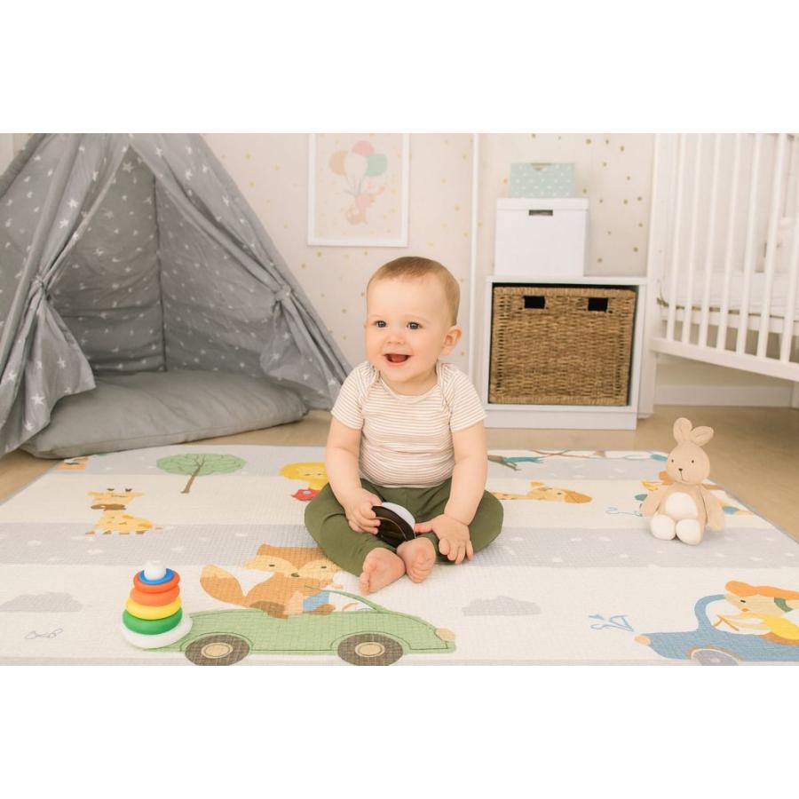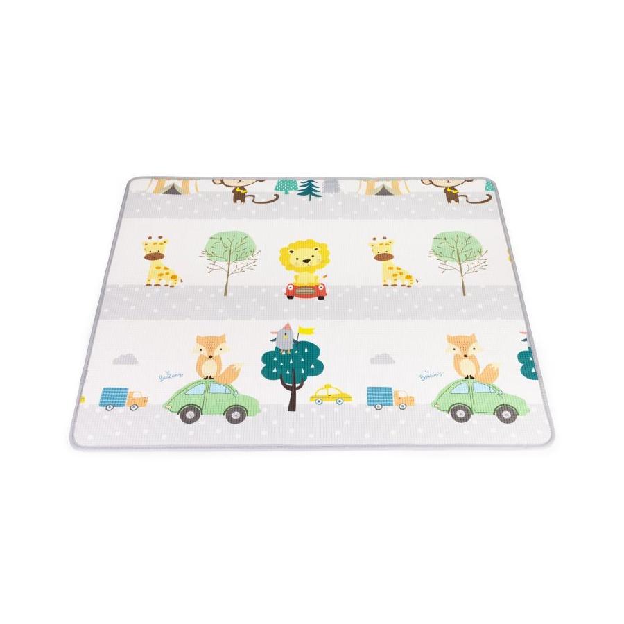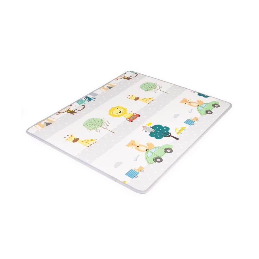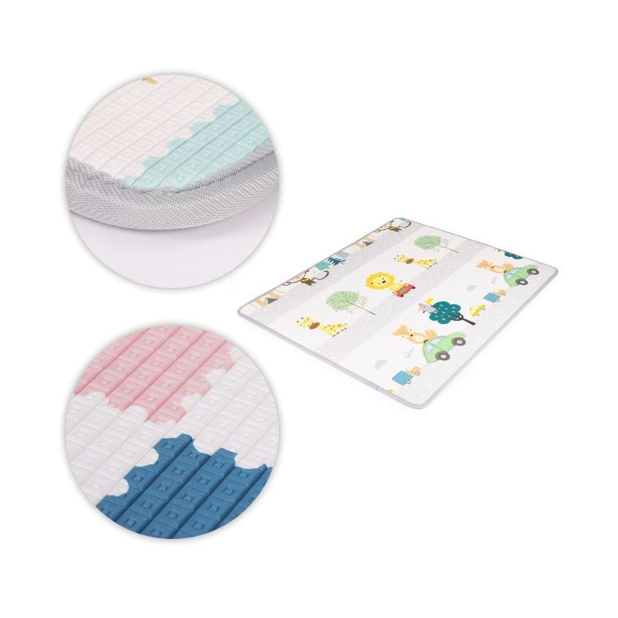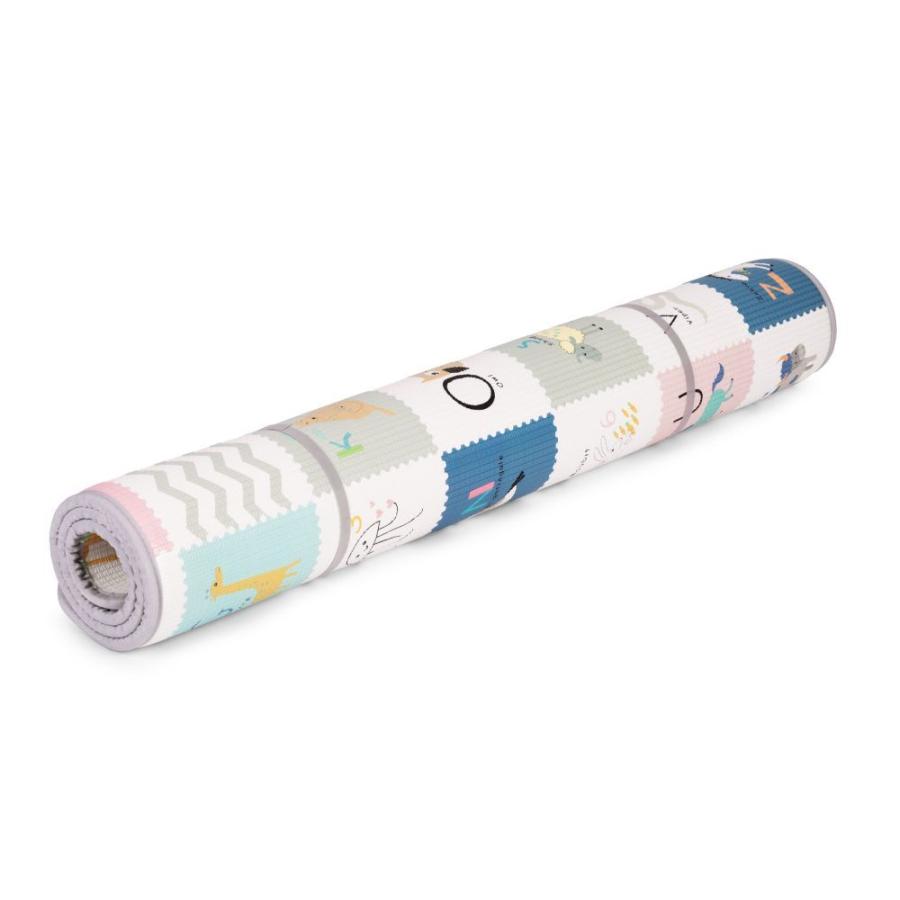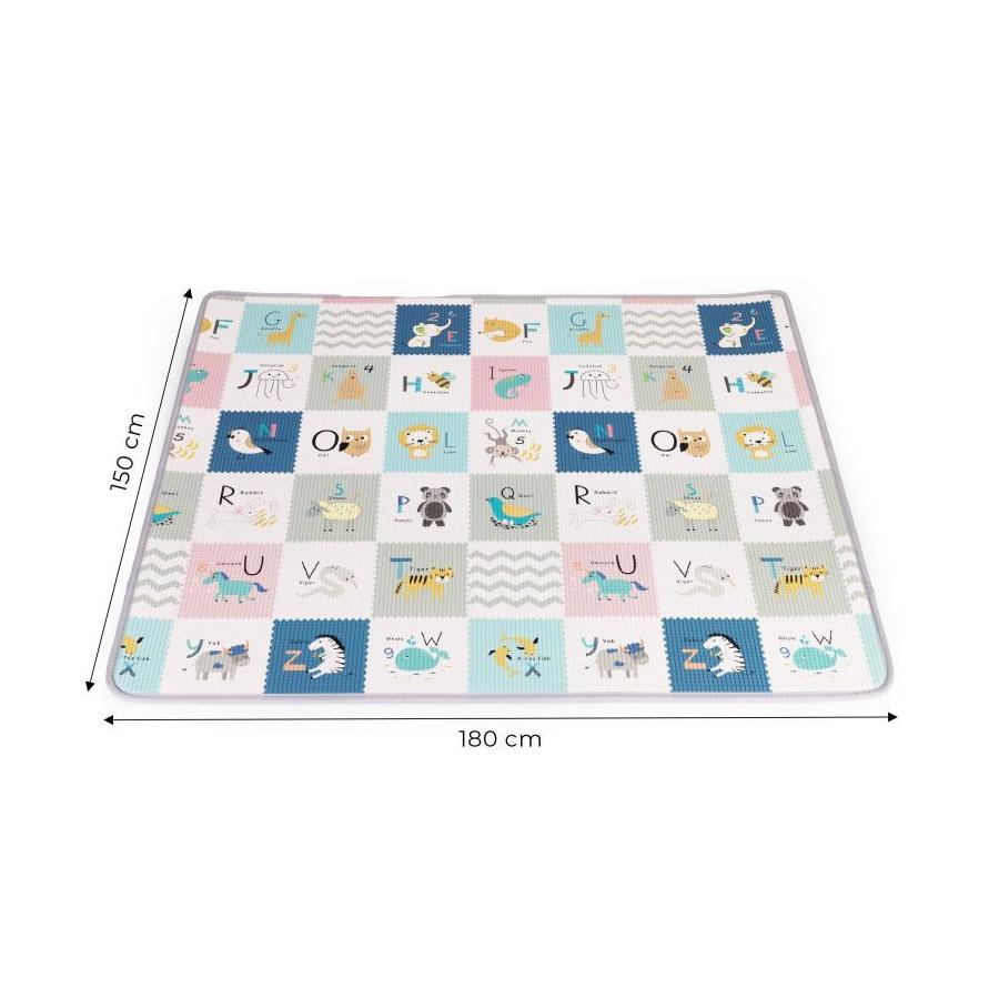 Obojstranná vzdelávacia podložka ECOTOYS je bezpečným hracím priestorom pre deti staršie ako 3 roky. Vyrobená z mäkkej, 1 cm hrubej peny EVA, účinne tlmí pády a poskytuje príjemnú izoláciu od studených podláh. Vďaka svojim veľkým rozmerom 180 x 150 cm je ideálna do detskej izby, predškolskej školy alebo herne. Vyrobená z mäkkej, 1 cm hrubej peny EVA, účinne tlmí pády a poskytuje izoláciu od studených podláh. Protišmykové výstupky zabraňujú kĺzaniu podložky počas hry, čím zaisťujú stabilitu a bezpečnosť. Obojstranná potlač s abecedou a anglickými slovami na jednej strane a ilustráciami zvierat, vozidiel a prírody na druhej strane stimuluje predstavivosť a podporuje učenie. Zaoblené, mäkké okraje ďalej zvyšujú pohodlie a chránia pred odermi. Vďaka praktickej funkcii rolovania a priloženým suchým zipsom sa dá podložka ľahko uskladniť alebo vziať so sebou na cesty.