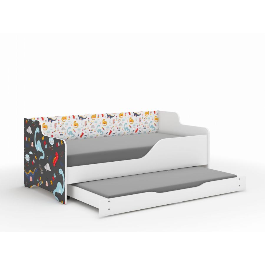Detská posteľ LILU v bielej farbe s bočnicami a dodatočnou funkciou spania v šuflíku - 160x80 cm s motívom dinosaurov, ktorá premení izbu vášho dieťaťa a zabezpečí mu zdravý a pokojný spánok každú noc a je vyrobená z kvalitných materiálov.