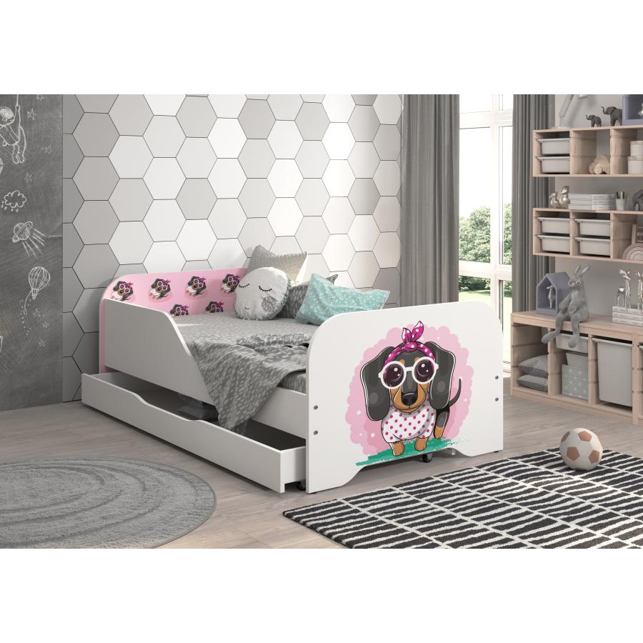 Detská posteľ MIKI v bielej farbe s bočnicami a šuflíkom - 160x80 cm s motívom ružového jazvečíka, ktorá premení izbu vášho dieťaťa a zabezpečí mu zdravý a pokojný spánok každú noc a je vyrobená z kvalitných materiálov.