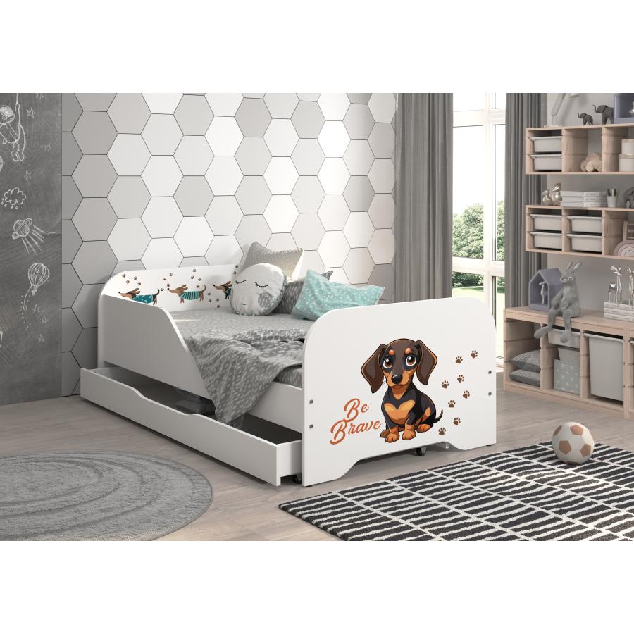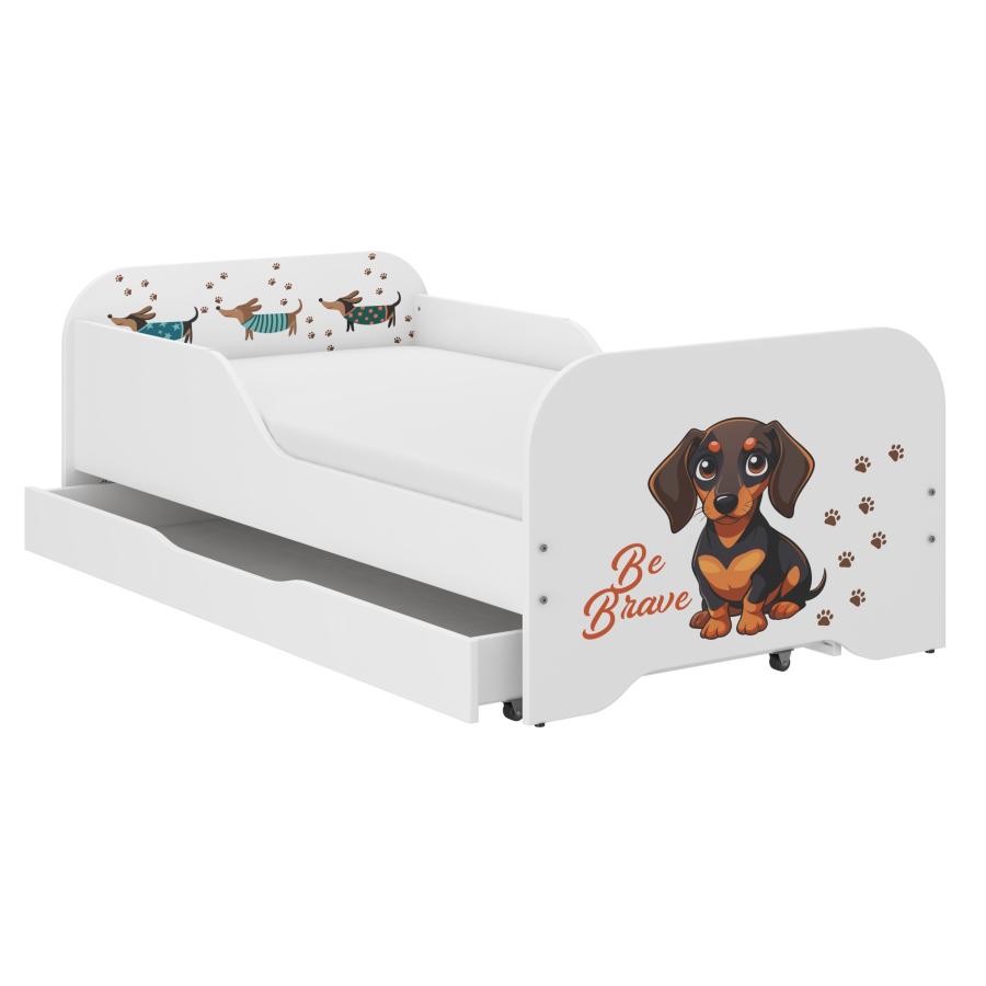 Detská posteľ MIKI v bielej farbe s bočnicami a šuflíkom - 140x70 cm s motívom odvážneho jazvečíka, ktorá premení izbu vášho dieťaťa a zabezpečí mu zdravý a pokojný spánok každú noc a je vyrobená z kvalitných materiálov.