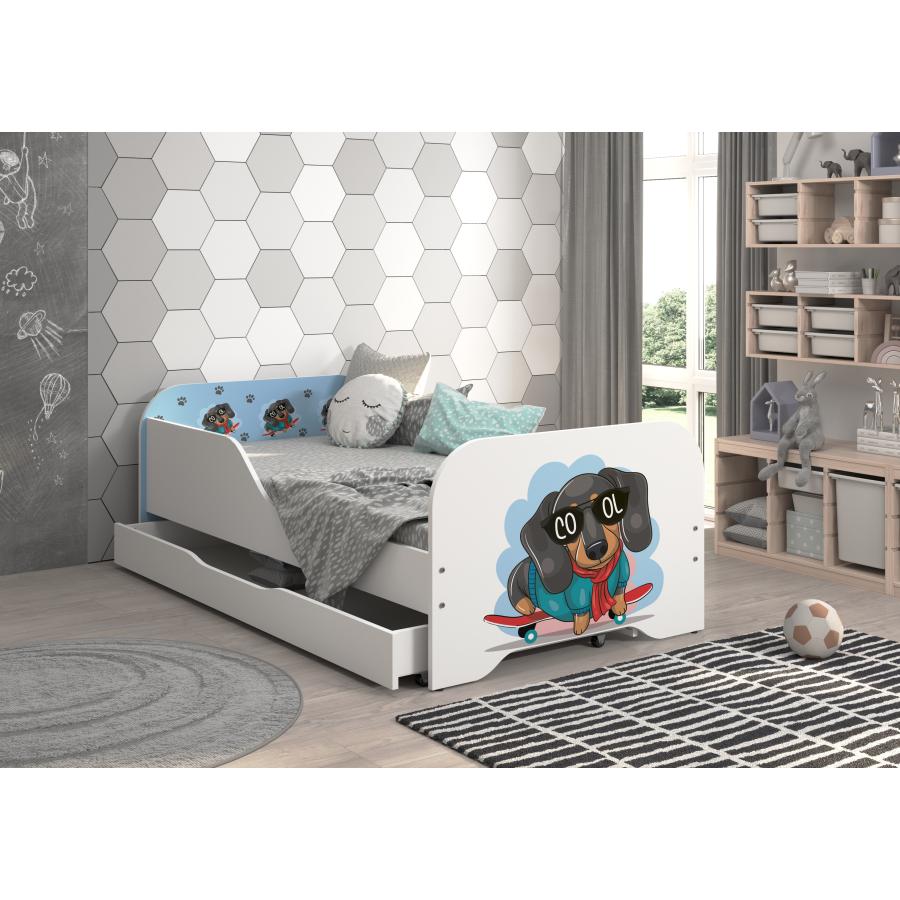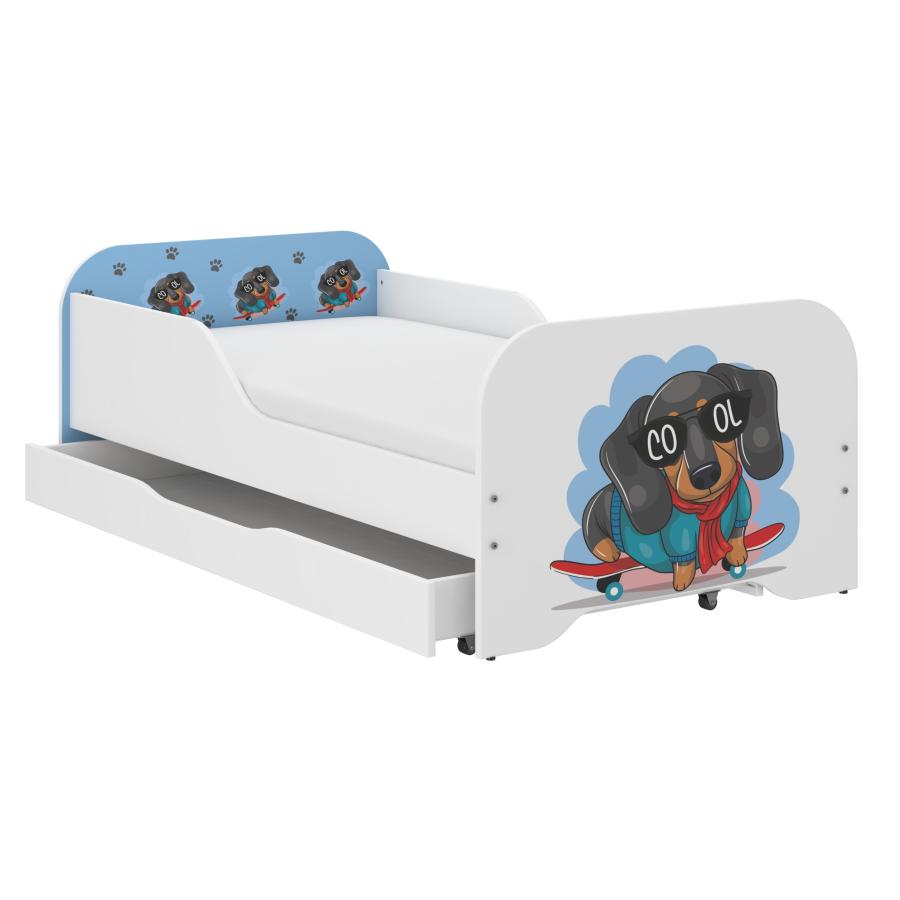 Detská posteľ MIKI v bielej farbe s bočnicami a šuflíkom - 140x70 cm s motívom jazvečíka na skateboarde, ktorá premení izbu vášho dieťaťa a zabezpečí mu zdravý a pokojný spánok každú noc a je vyrobená z kvalitných materiálov.